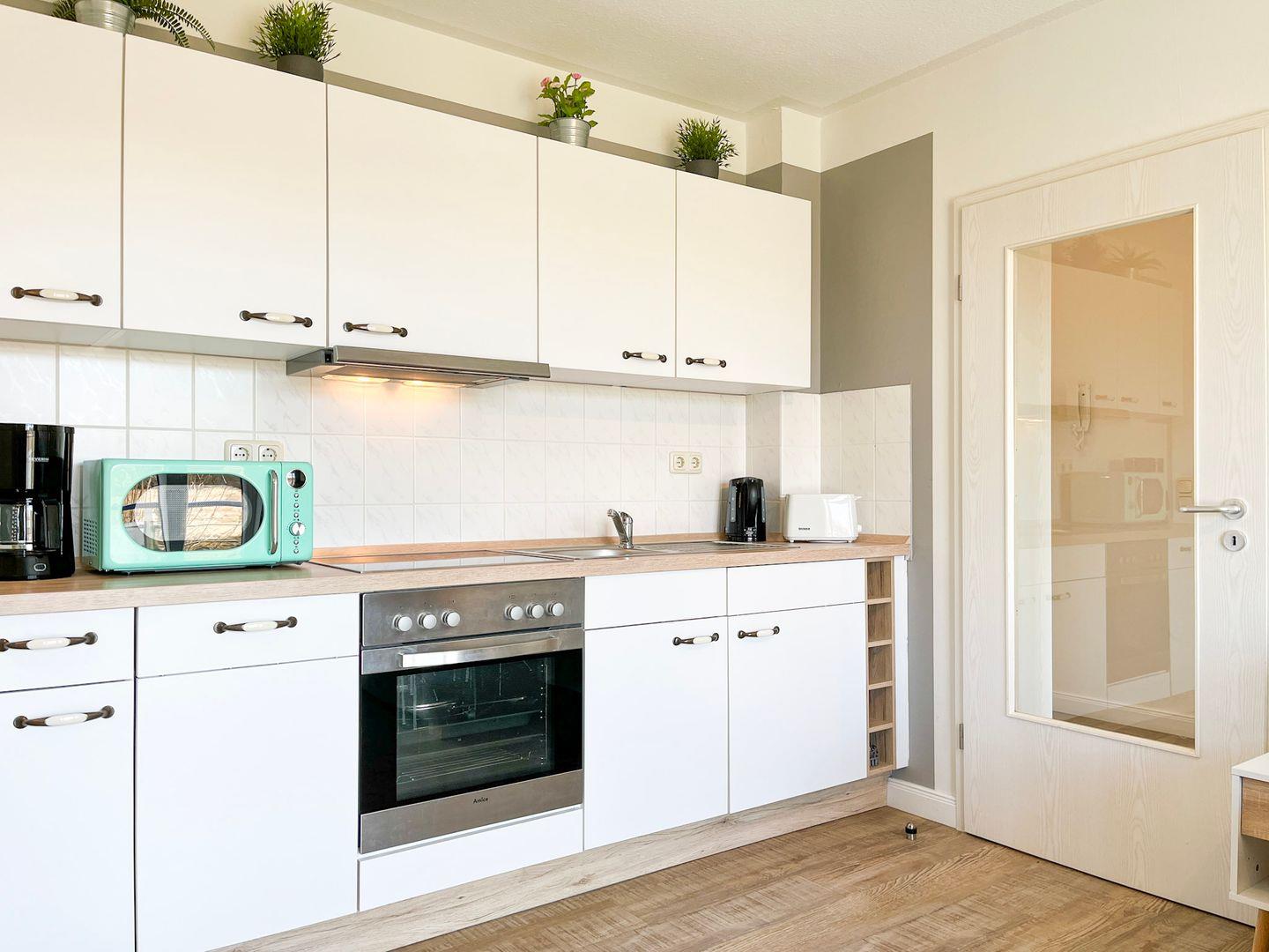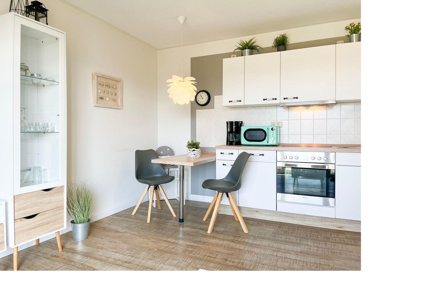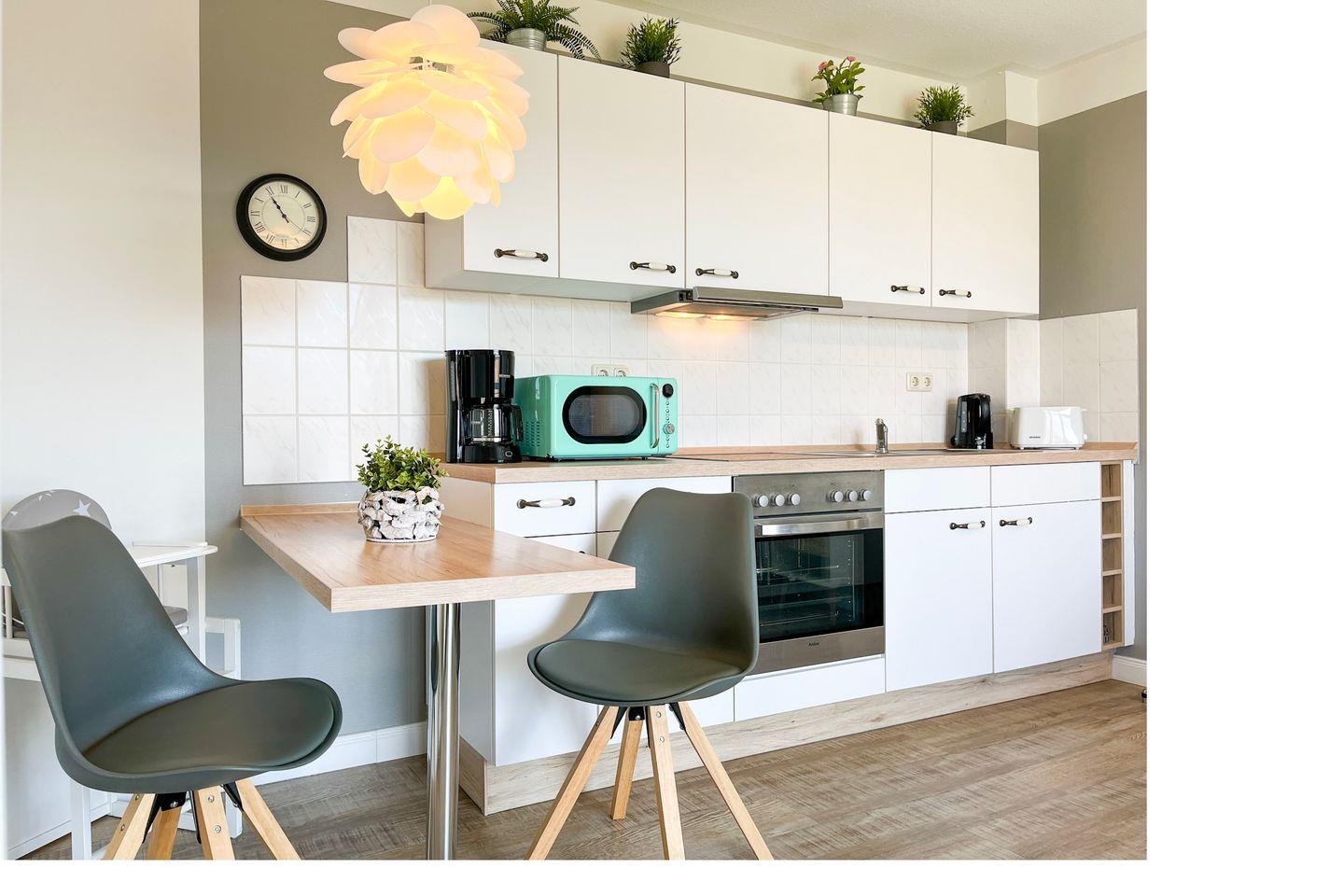 Die Küchenzeile ist mit einem Herd mit einem 4-Platten-Cerankochfeld und Backofen, einer Mikrowelle, einem Geschirrspüler und vielem mehr ausgestattet. In der angrenzenden Essecke lässt es sich vorzüglich dinieren. In diesem Objekt sind maximal zwei Haustiere erlaubt!