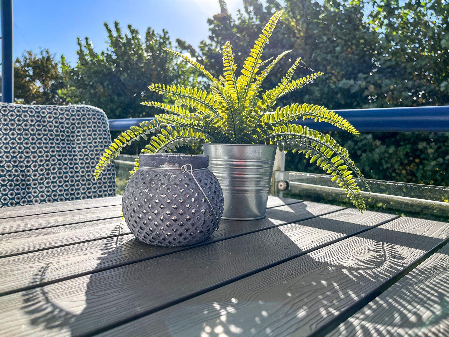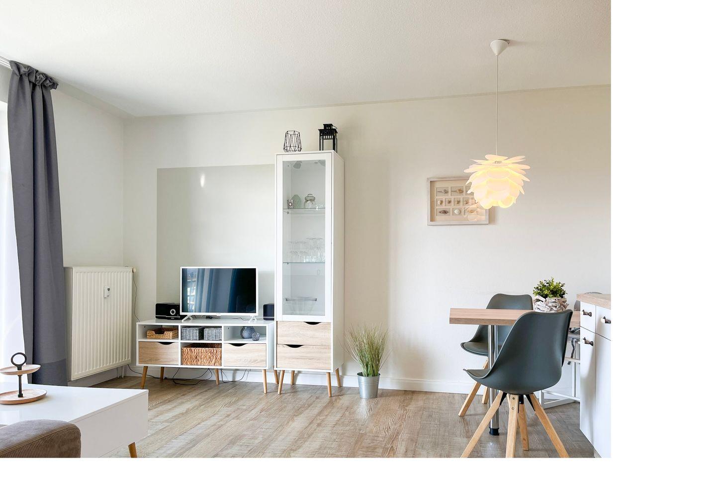 Im sonnendurchfluteten Wohnzimmer mit einer ausziehbaren Doppelschlafcouch sorgt ein SAT-Flatscreen-Fernseher mit Sky-Empfang für Kurzweil – nicht nur an Regentagen. Direkt vom Wohnzimmer gelangst du auf den großen Südbalkon mit den gemütlichen Balkonmöbeln. Der Blick auf die Haffwiesen ist phänomenal.