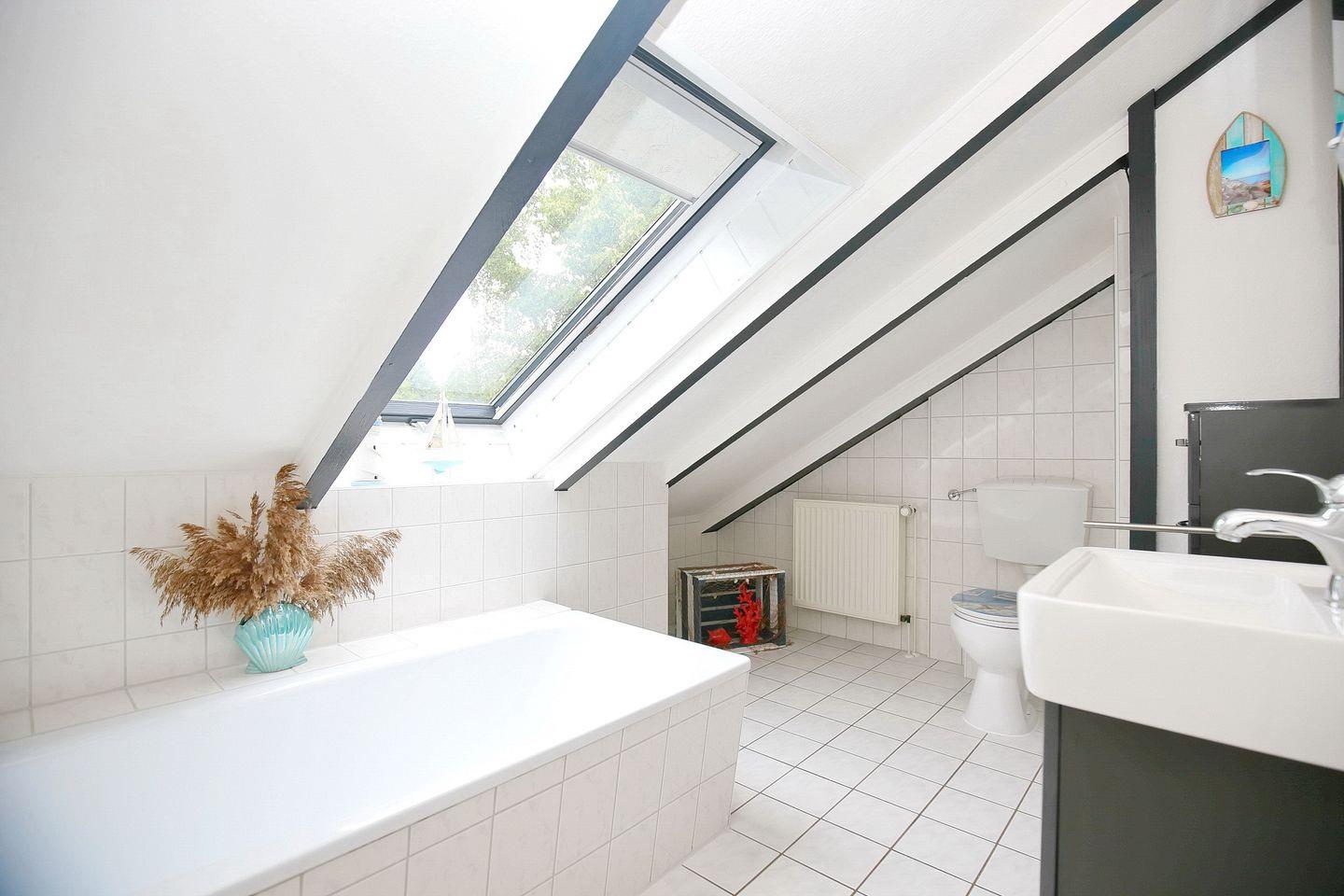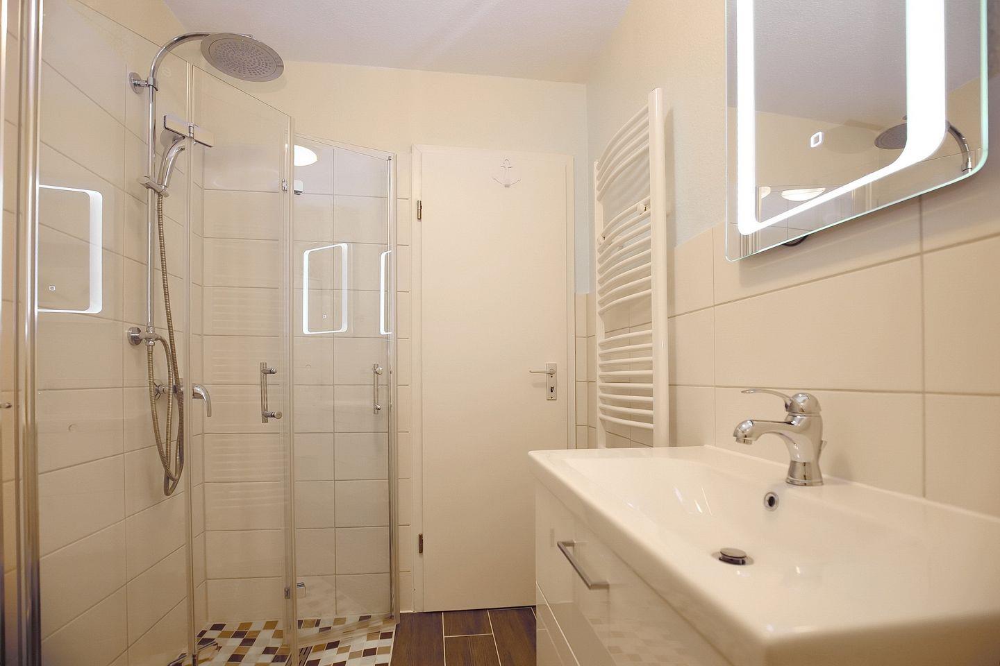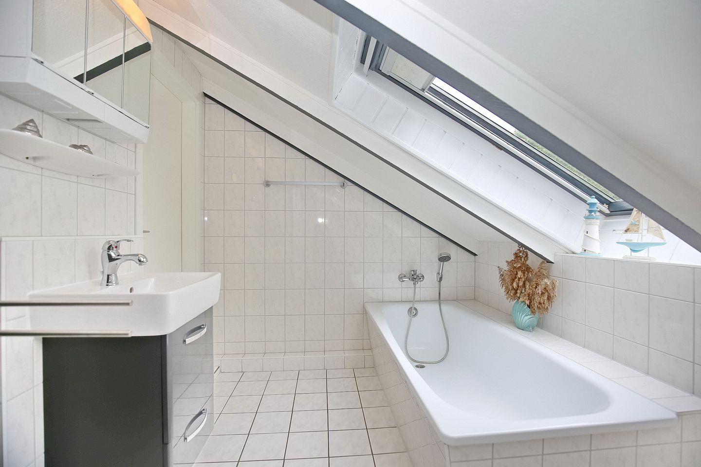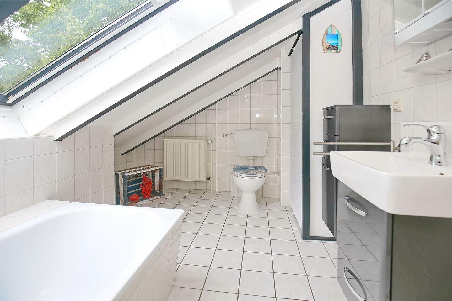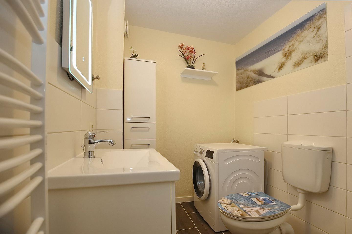 Im Erdgeschoss des Ferienhauses befindet sich ein Duschbad mit WC. Eine Waschmaschine steht hier für dich zur Verfügung. Ein zusätzliches Bad mit Badewanne und WC kann im Obergeschoss genutzt werden.