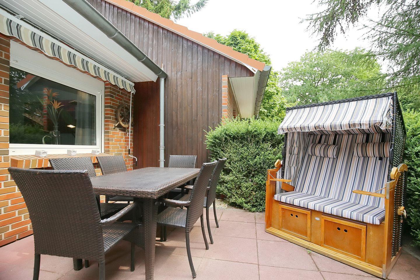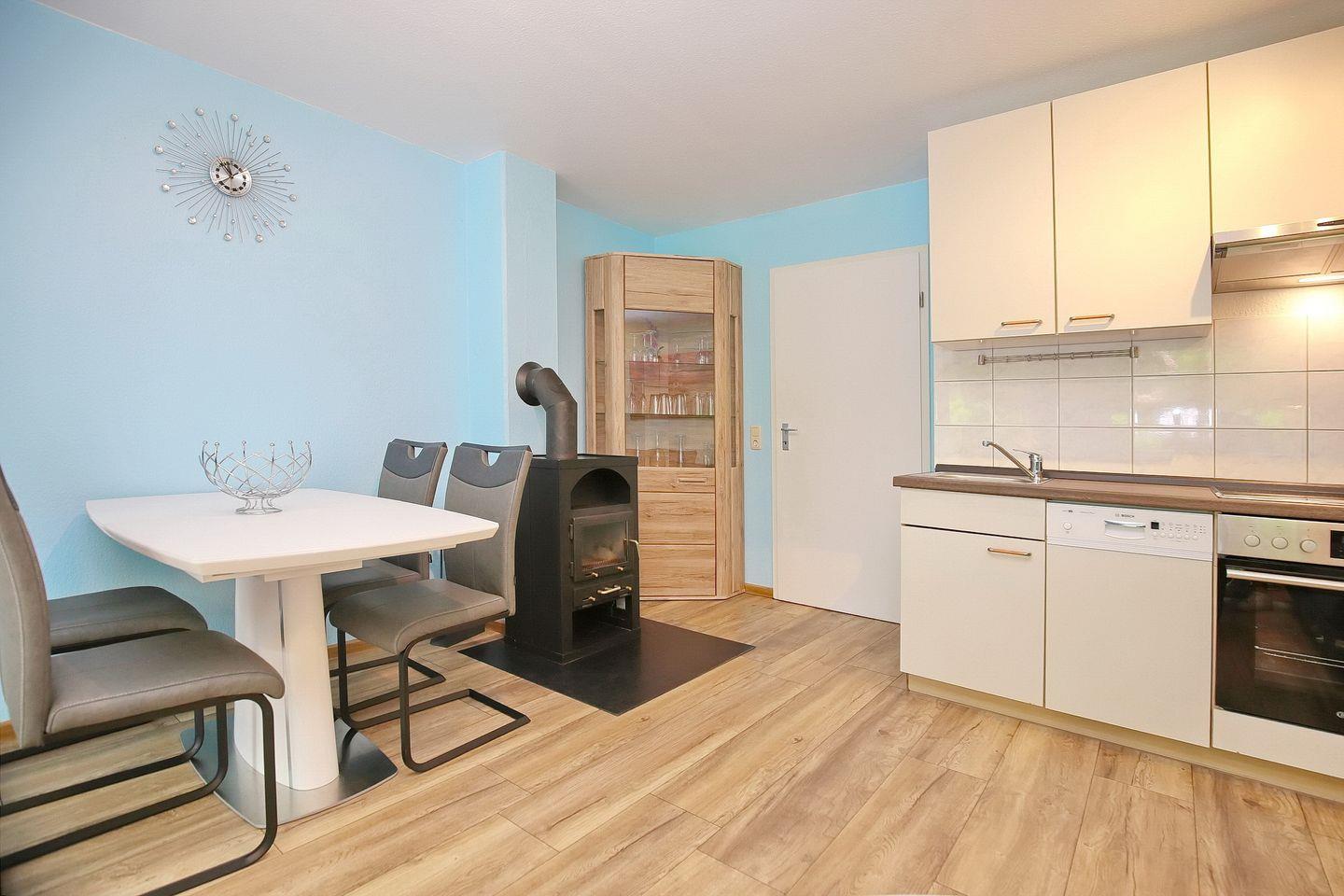 Neben der modernen Einrichtung überzeugt das Ferienhaus mit hellen freundlichen Räumen. Das behagliche Wohnzimmer bietet eine ausziehbare Doppelschlafcouch (180 x 200 cm). Ein Flachbild-TV und die Stereoanlage mit CD-Player sorgen für Kurzweil an Regentagen. Der Kamin sorgt auch an ungemütlichen Tagen für wohlige Wärme. Der Wohn- und Essbereich ist offen miteinander verbunden und grenzt an die gut sortierte Küchenzeile. WLAN (ohne Gewähr) steht dir kostenfrei zur Verfügung. Die südlich gelegene, möblierte Terrasse, auf der sich ein Strandkorb befindet, ist von dem Wohnzimmer aus betretbar.