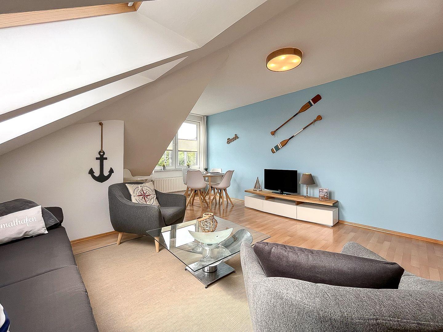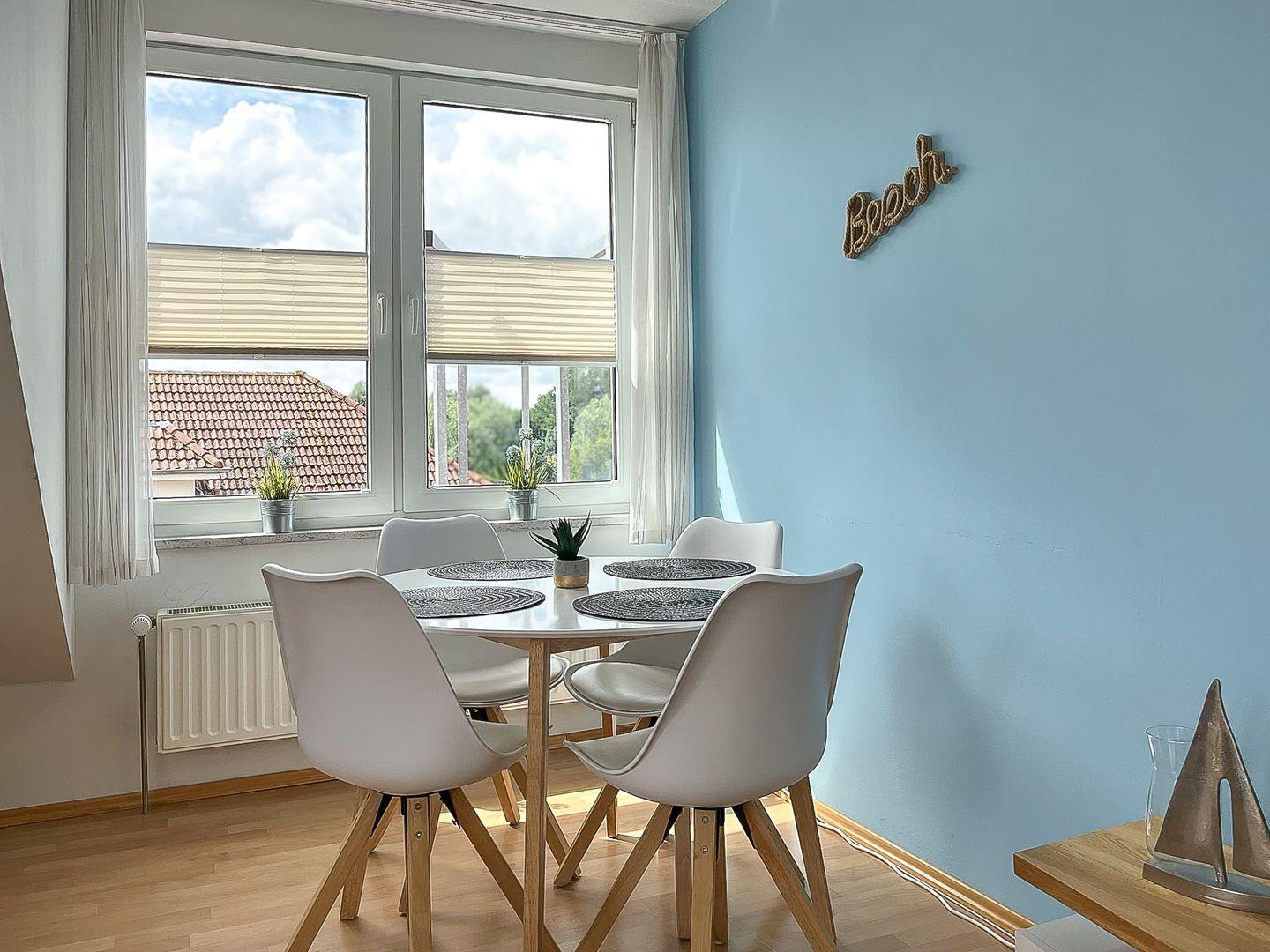 Die Süd-Ost-Ausrichtung und die vielen Fenster sorgen für angenehme Helligkeit in allen Räumen. Dein Wohn- und Essraum ist mit einer Couch mit Schlaffunktion (145 x 190 cm), zwei Sesseln sowie einem Flachbildfernseher ausgestattet. Darüber hinaus findet in diesem Raum der große Esstisch für beispielsweise das gemeinsame Frühstück oder die Spieleabende Platz.