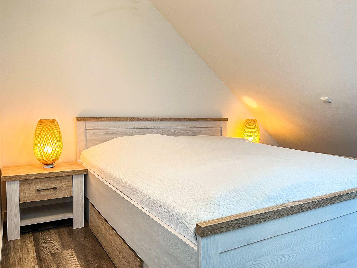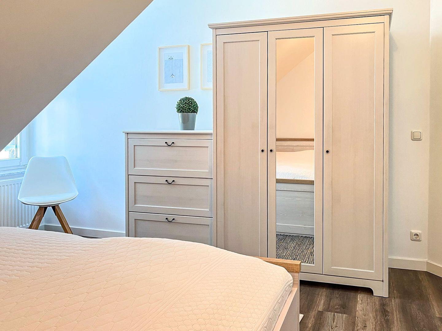 Das Schlafzimmer ist mit einem Doppelbett (2 x 90 x 200 cm) und einem Kleiderschrank für deine Urlaubsgarderobe eingerichtet. Am Fenster befindet sich ein Plissee.