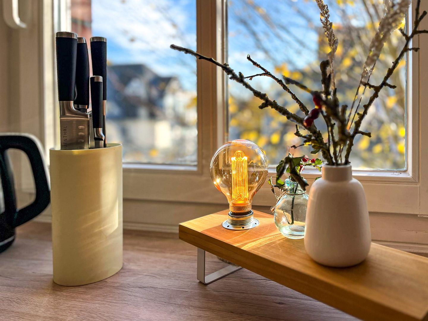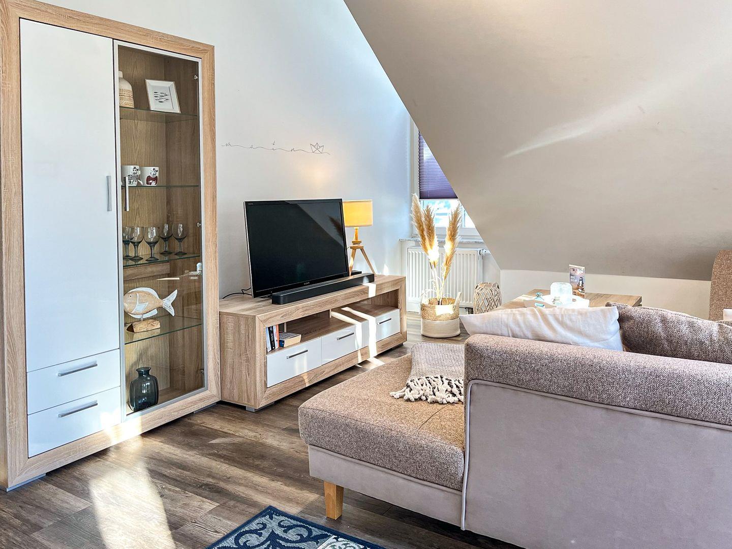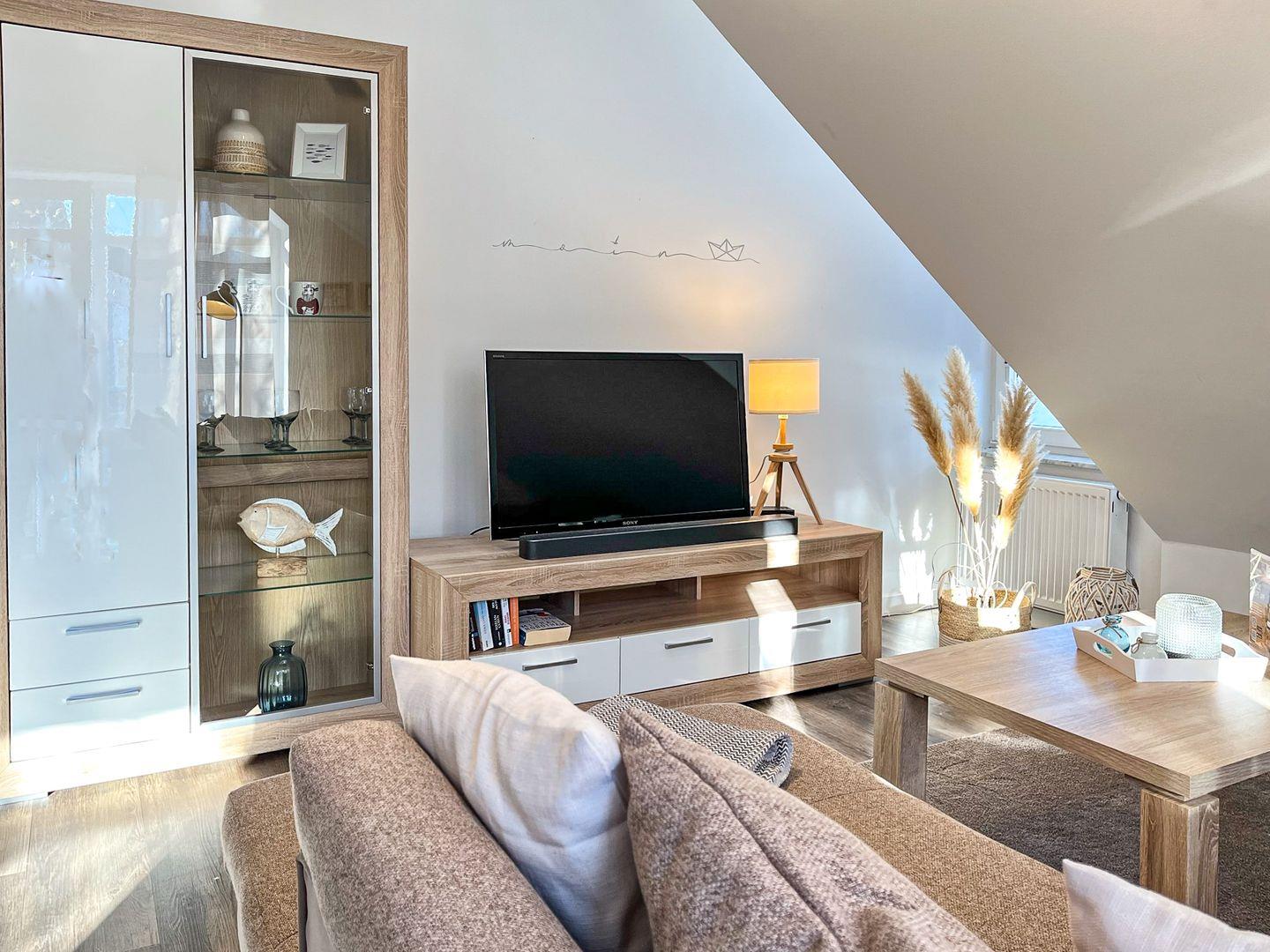 Im Wohnzimmer steht dir ein Smart-TV für die Unterhaltung am Abend zur Verfügung. Vorhänge am Fenster bieten Sichtschutz.