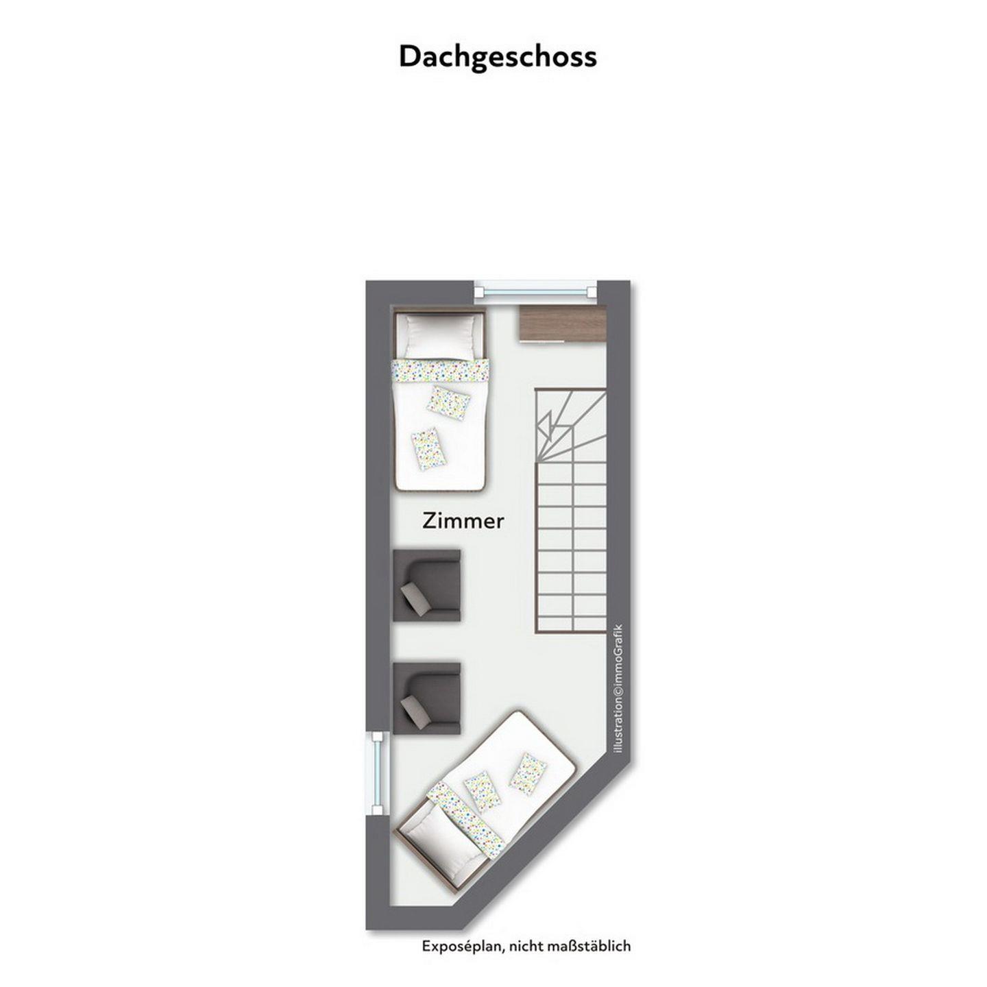 Das zweite Schlafzimmer befindet sich auf dem Spitzboden und verfügt über zwei Einzelbetten.