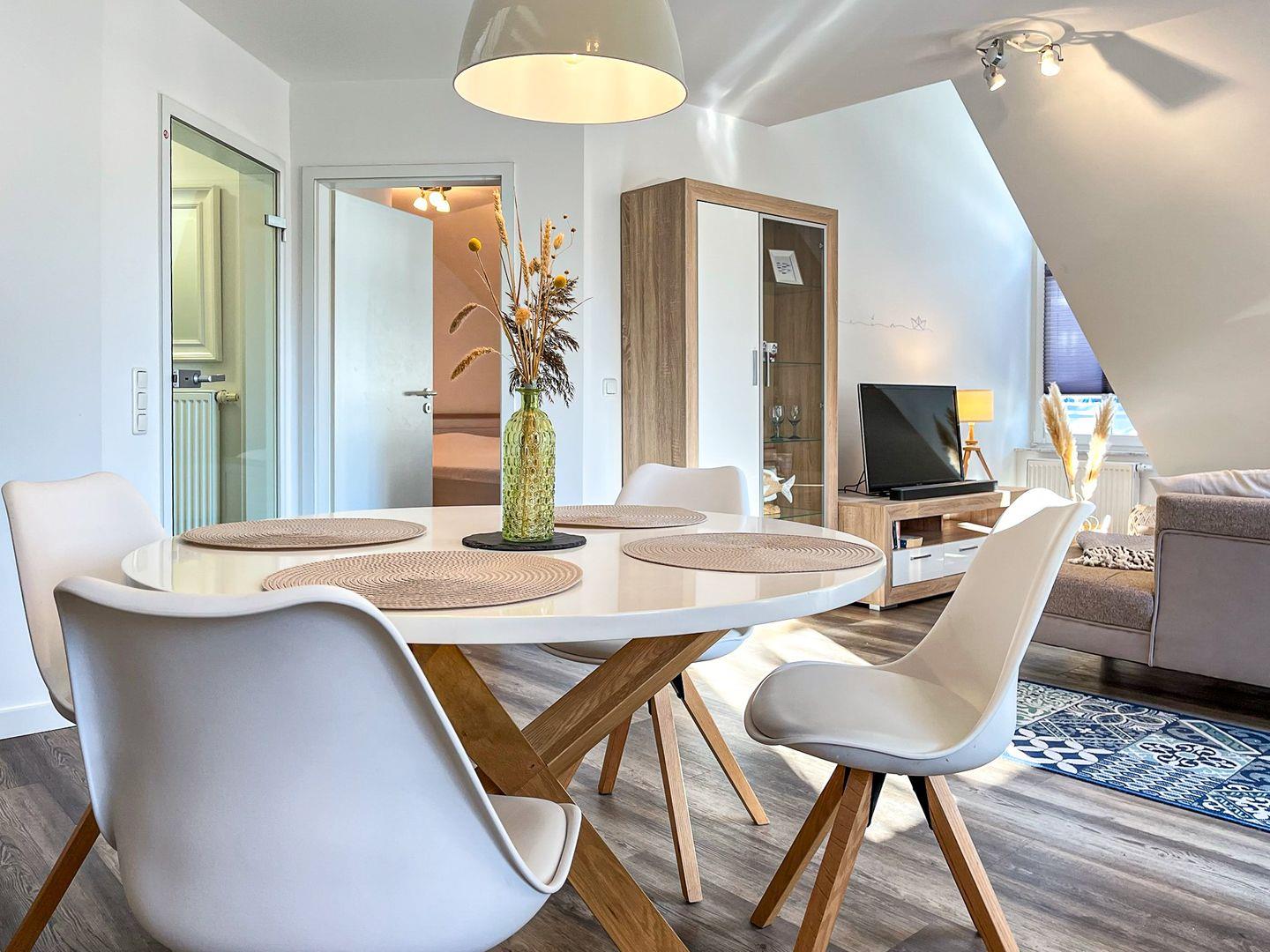 Deine Ferienwohnung Nr. 19 im Haus am Teich ist eine 3-Zimmerwohnung für bis zu 4 Personen, die über zwei Etagen verläuft.