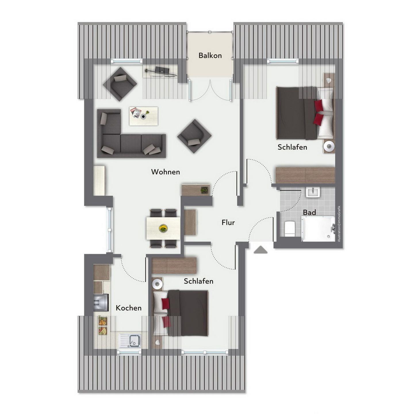 Das lichtdurchflutete Wohnzimmer ist mit einer modernen Couchgarnitur ausgestattet. Hier befindet sich auch der Essplatz für die gemeinsamen Mahlzeiten. Der Flachbild-TV, ein Blu-ray-Player / DVD-Player und eine Stereoanlage sorgen für Abwechslung. Aus dem Wohnbereich betrittst du den südlich ausgerichteten, möblierten Balkon.