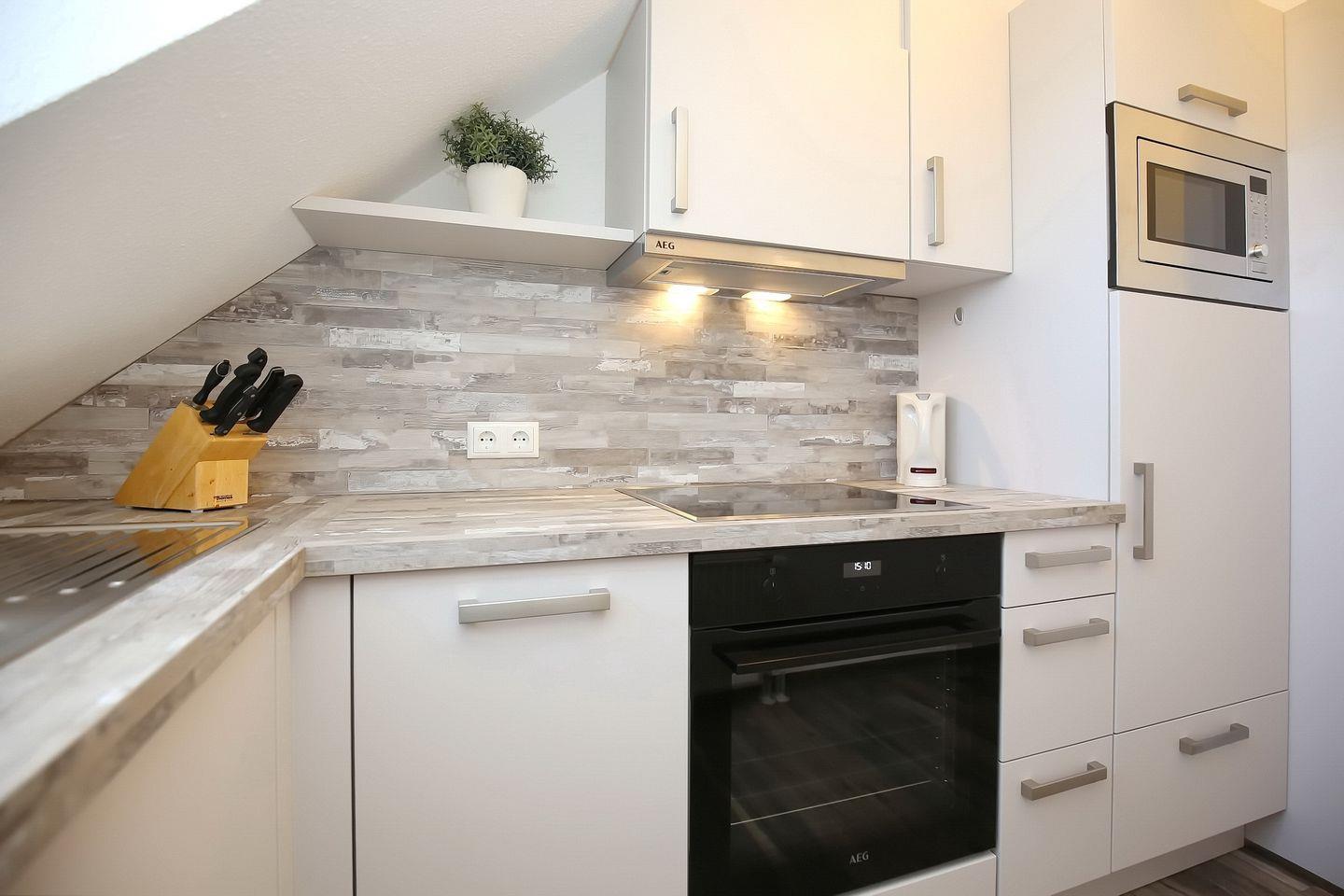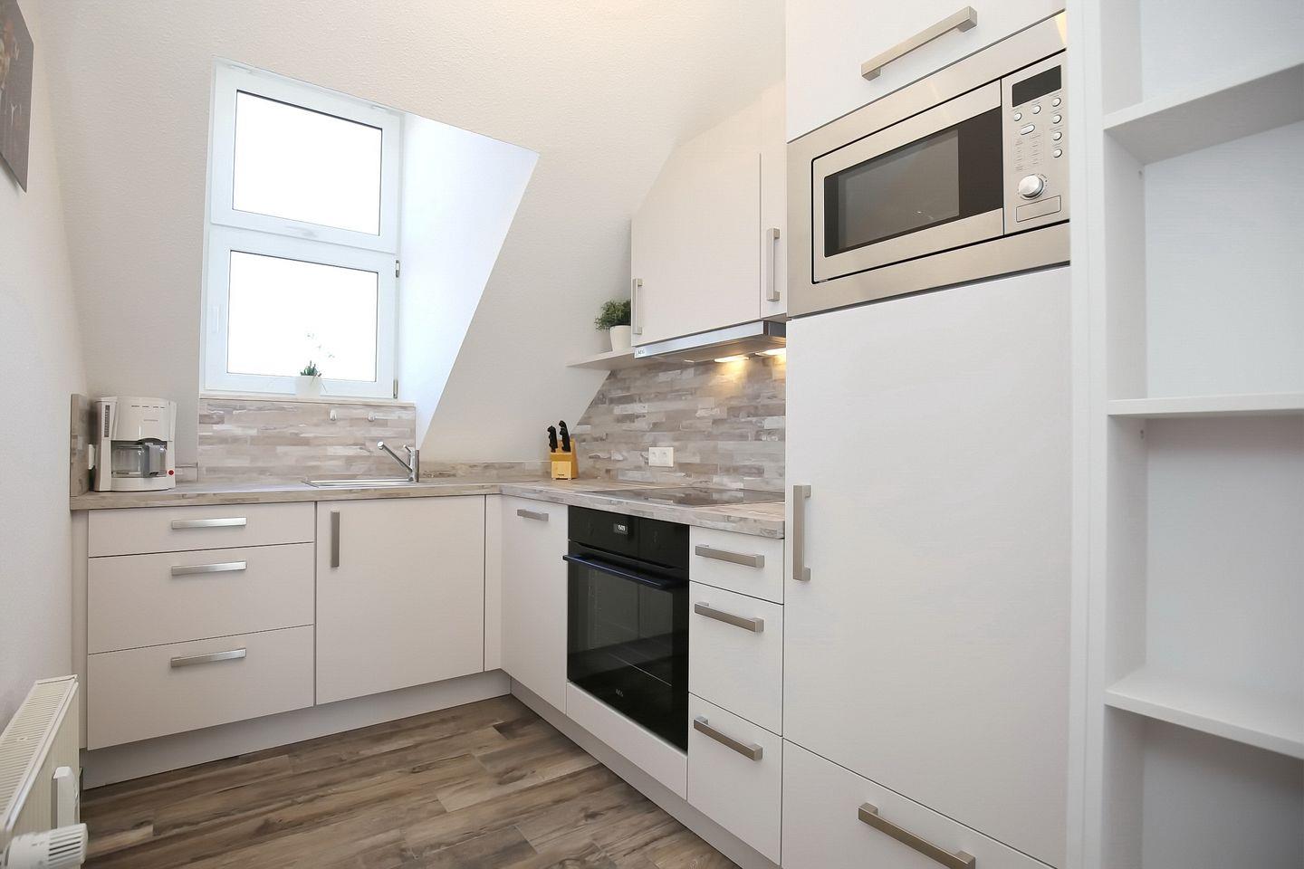 In der separaten Küche findest du alles für die Zubereitung deiner Mahlzeiten. Dazu gehören auch ein Geschirrspüler, ein Ceran-Kochfeld mit Backofen, eine Mikrowelle eine Filterkaffeemaschine und ein Kühlschrank mit Gefrierfach.
