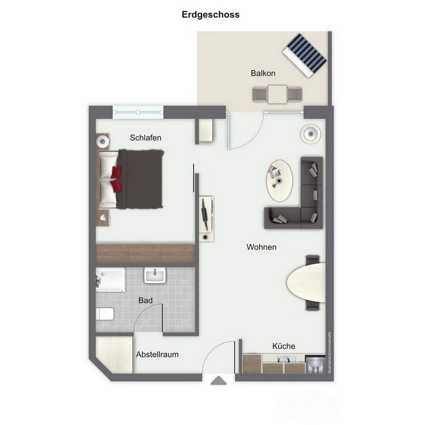 Im Wohnzimmer sorgen ein TV-Flatscreen mit integriertem Radio für deine Unterhaltung. Direkt vom Wohnzimmer gelangst du auf die in Süd-Ost Richtung gelegene möblierte Terrasse mit einem Strandkorb.