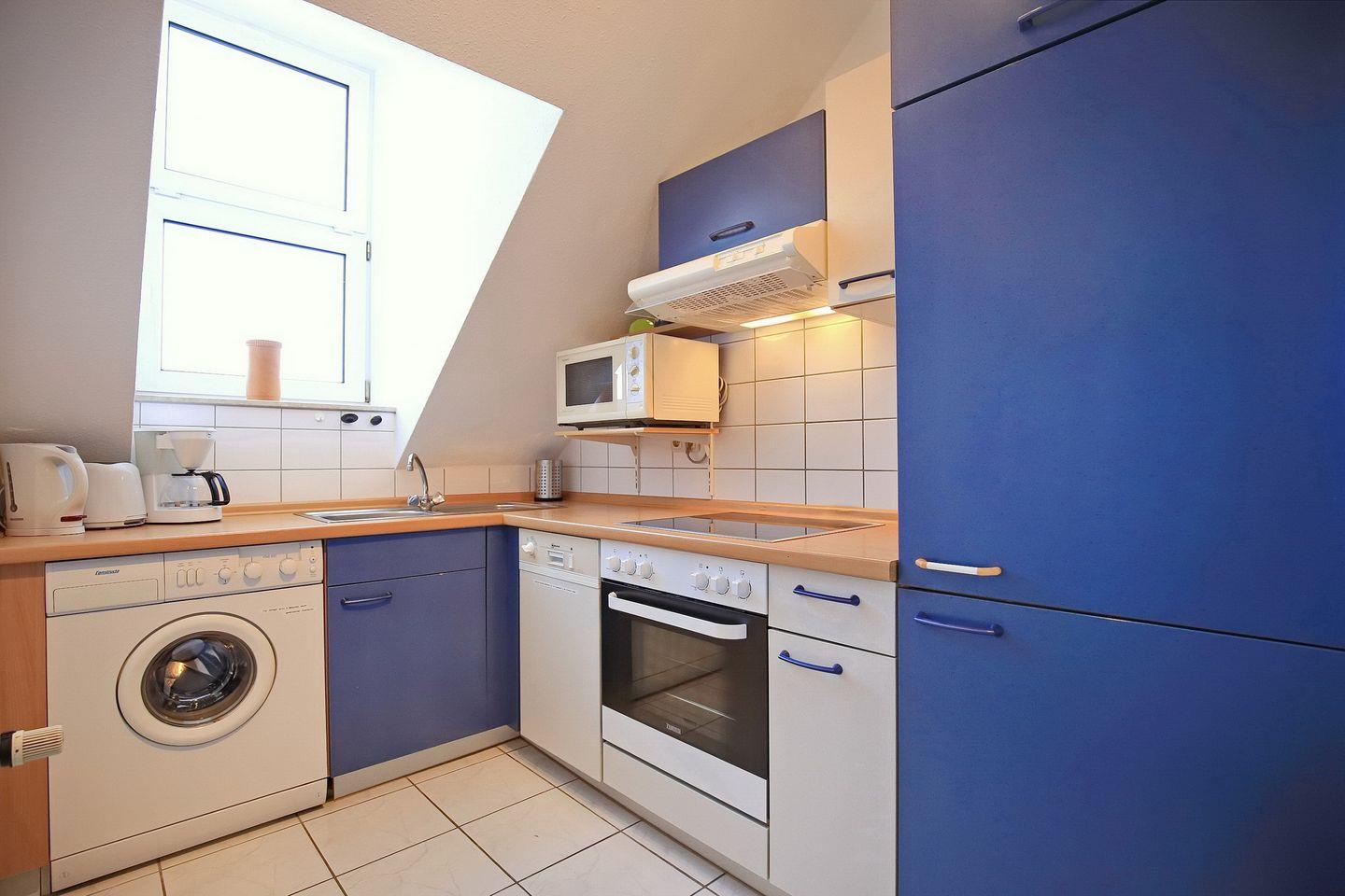 Die praktisch ausgestattete separate Küche bietet ein 4-Plattenkochfeld mit Backofen, einen Kühlschrank mit Gefrierfach, eine Mikrowelle und einen Geschirrspüler. Auch eine Waschmaschine kann genutzt werden. Im Flur kannst du deine Urlaubsgarderobe in einem Kleiderschrank verstauen. Auf der unteren Ebene ist der Boden mit Laminat ausgelegt.