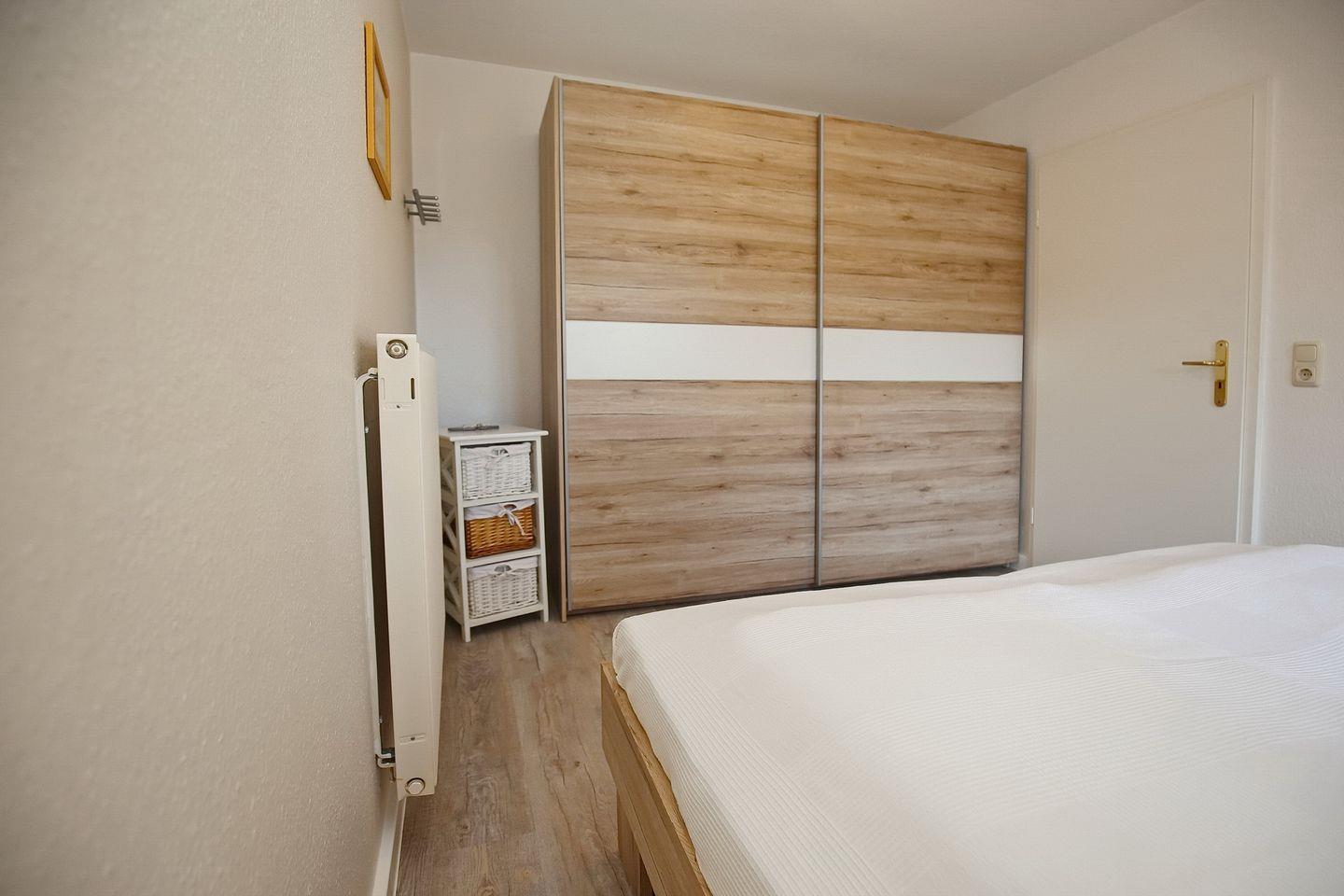 Das Schlafzimmer hat ein Doppelbett mit zwei Einzelmatratzen (90 x 200 cm) und einen geräumigen Kleiderschrank. Ein weiterer Kleiderschrank befindet sich im Eingangsbereich. Zur Verdunklung an den Fenstern dient im Schlafraum ein Rollo.