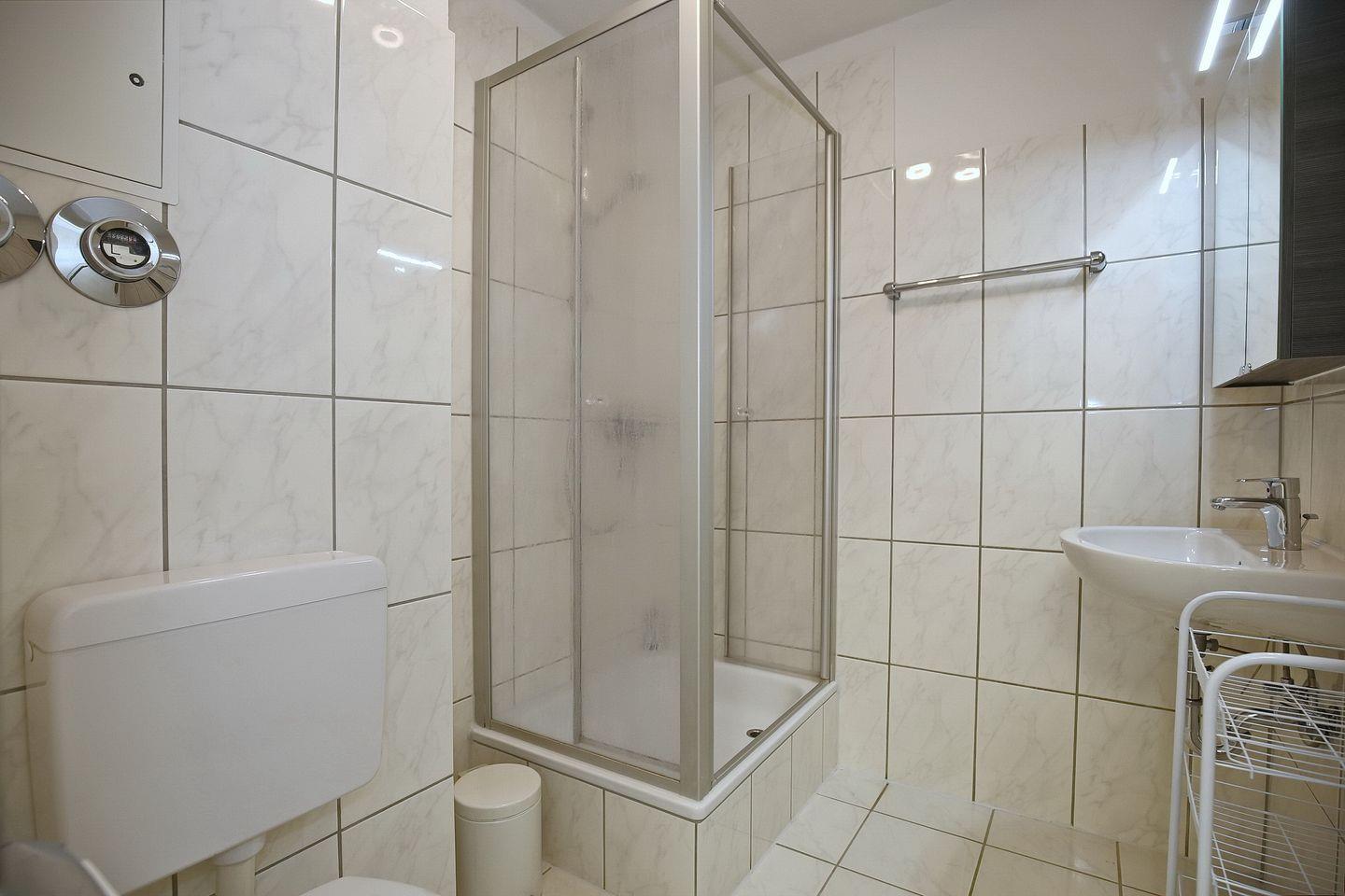 Das geflieste Duschbad bietet viele Abstellmöglichkeiten.