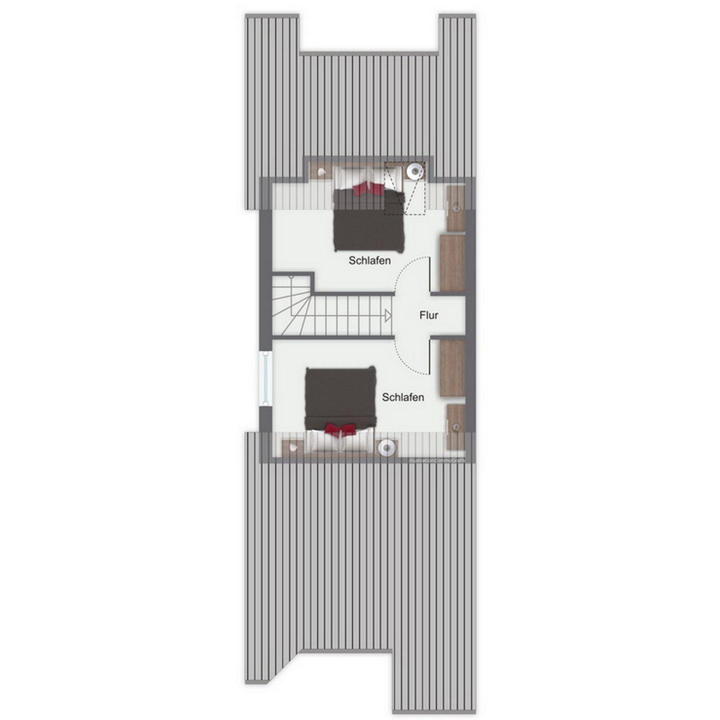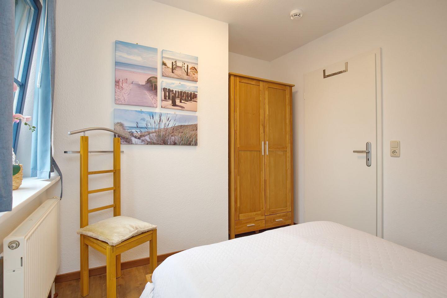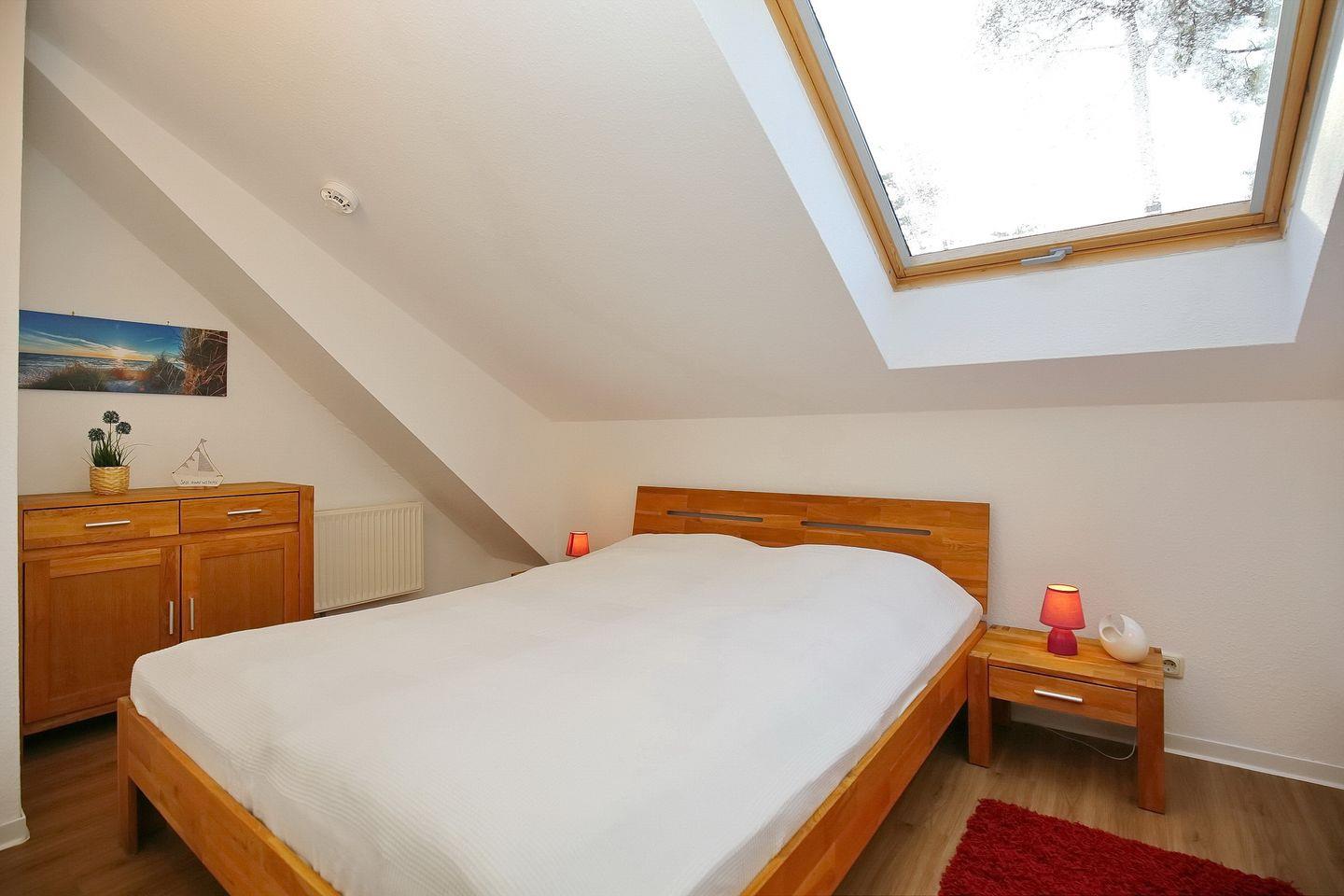 Die beiden weiteren Schlafzimmer erreichst du über die innenliegende Treppe im Wohnzimmer. Hier befinden sich jeweils ein Doppelbett (2 x 80 x 200 cm und 2 x 90 x 200 cm) und ein Kleiderschrank. Rollos zur Verdunklung dienen im linken Schlafzimmer auf der oberen Etage. Der rechte Schlafraum im Obergeschoss und das Schlafzimmer auf der unteren Ebene werden mit Vorhängen abgedunkelt.
