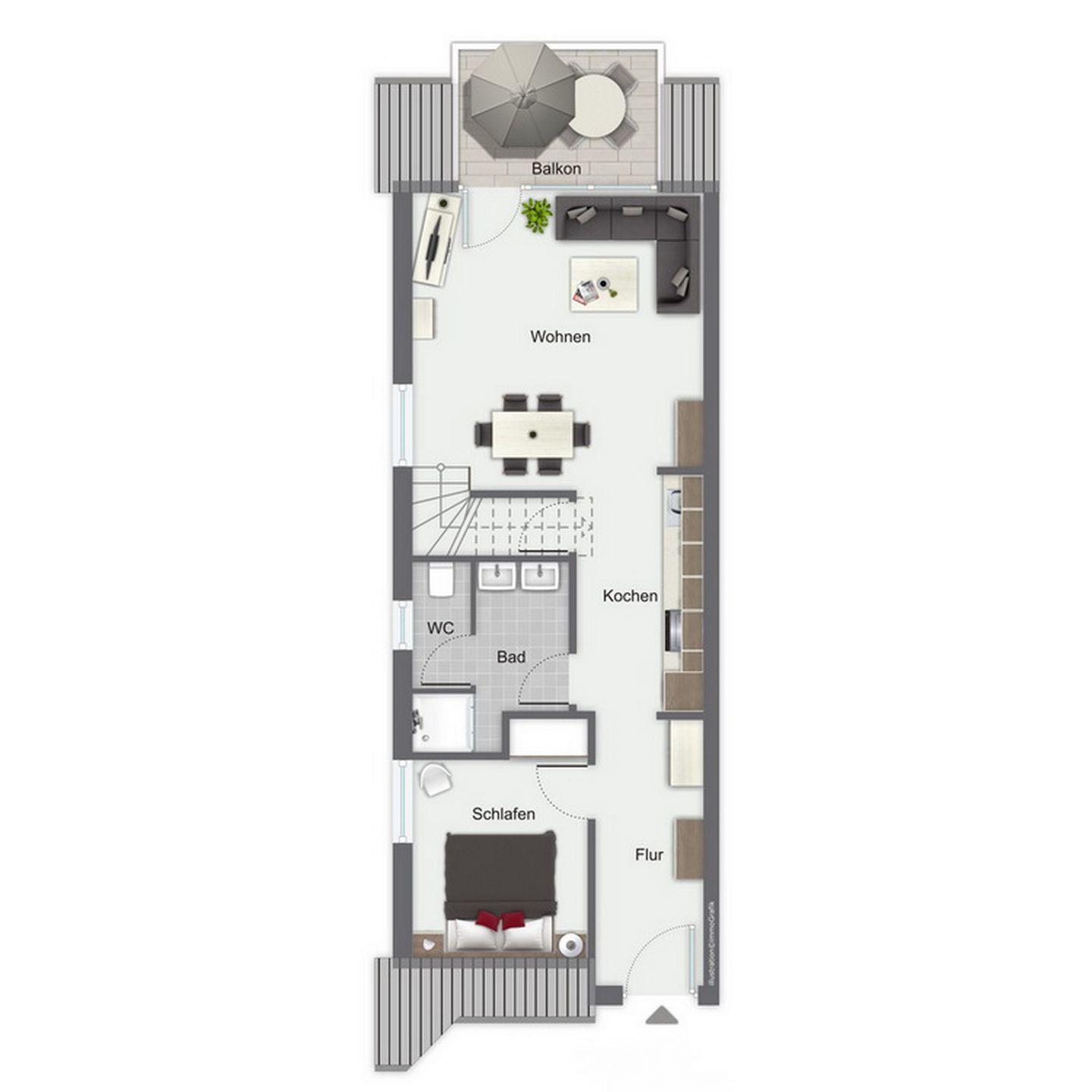 Die integrierte Küchenzeile ist neben einem 4-Plattenkochfeld mit Backofen, einem Geschirrspüler und einem Kühlschrank mit Gefrierfach mit allem ausgestattet, was du für die Zubereitung deiner Lieblingsmahlzeiten benötigst. Im Schlafzimmer im Untergeschoss sorgt ein Doppelbett (140 x 200 cm) für ruhigen Schlaf. Deine Garderobe kannst du im Kleiderschrank verstauen.