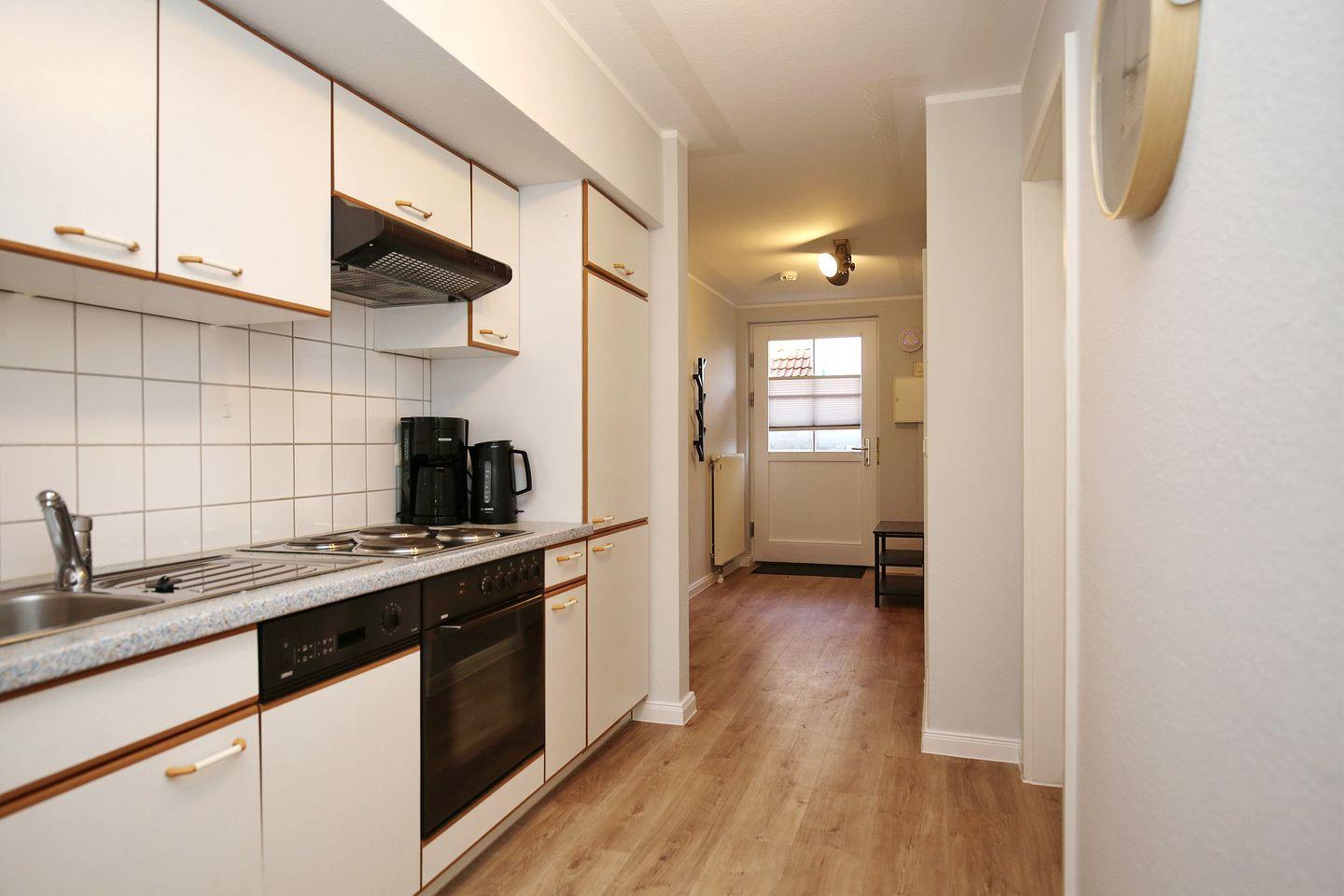 Die Küchenzeile ist ausgestattet mit einem Geschirrspüler, 4-Platten-Kochfeld, Backofen und einem Kühlschrank mit Gefrierfach. Im gesamten Wohn- und Schlafbereich ist ein hochwertiger Designbelag ausgelegt.