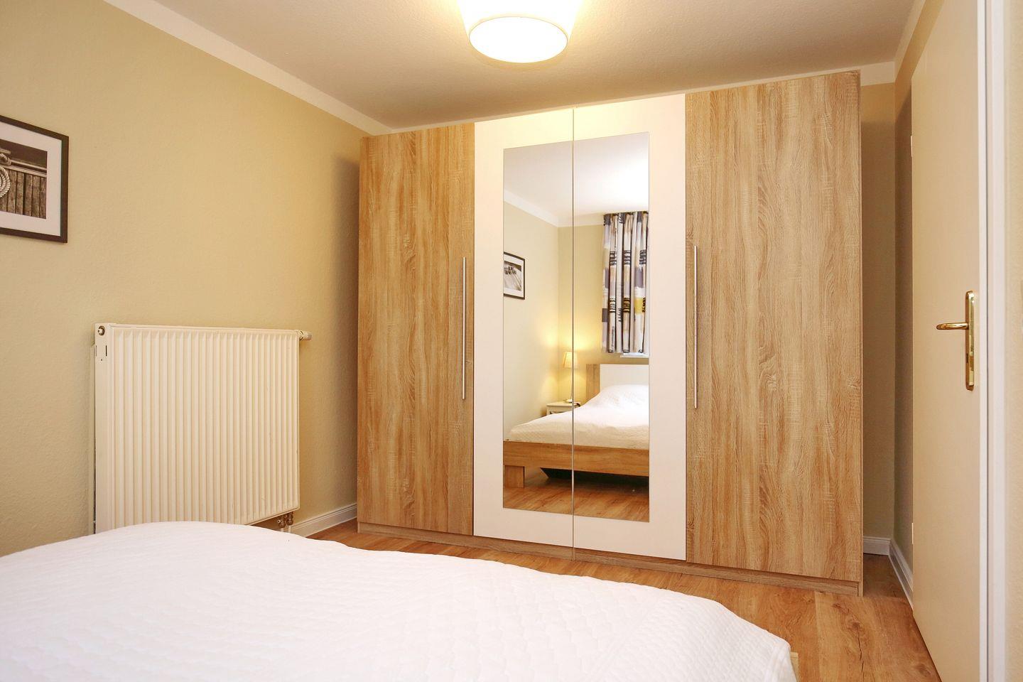 Im Schlafzimmer sorgt ein Doppelbett (2x 90 x 200 cm) für erholsamen Schlaf, der große Kleiderschrank bietet viel Platz für deine Urlaubsgarderobe.