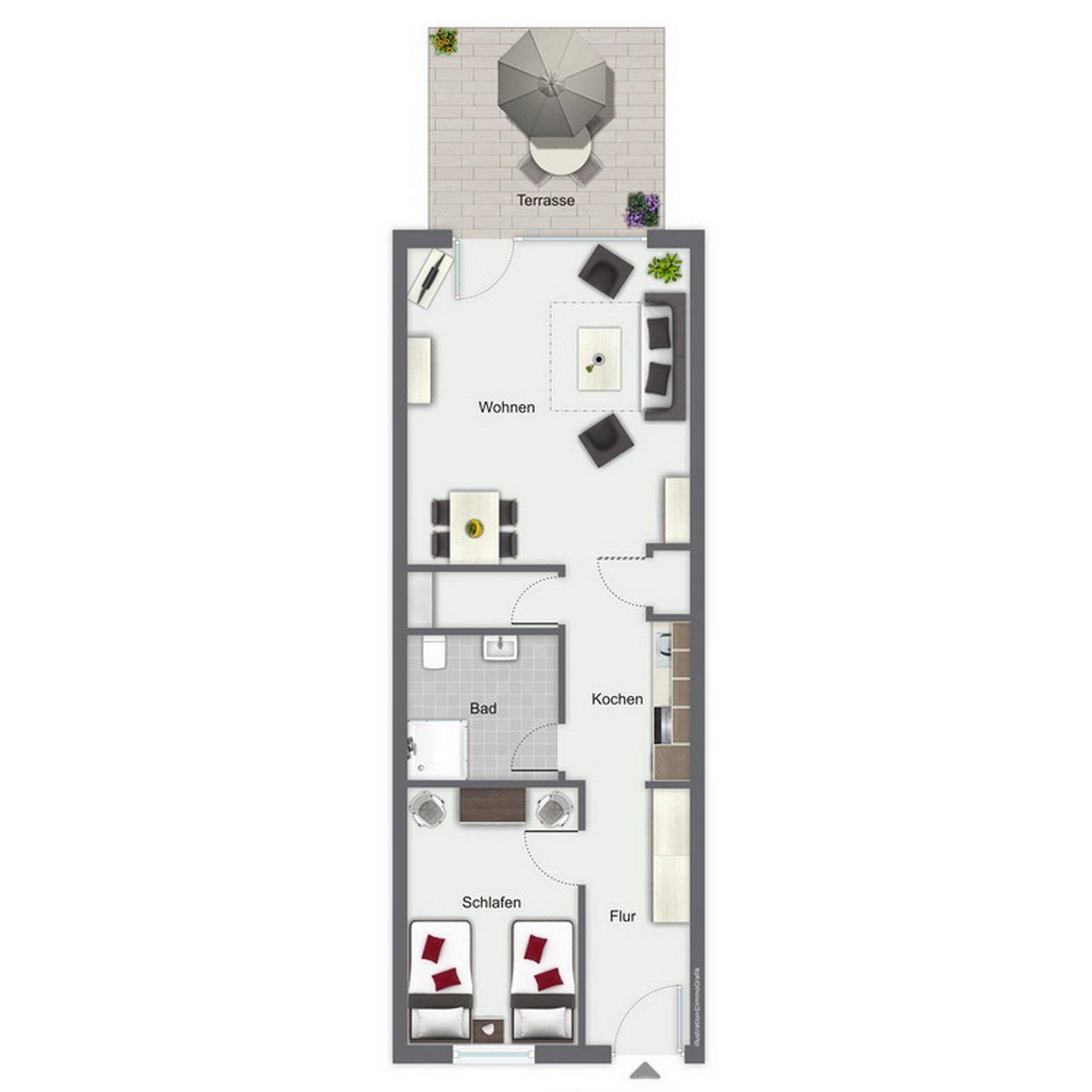 Zur ca. 55 m² großen Erdgeschoss-Wohnung gehört eine überdachte Süd-West-Terrasse. Während deines Aufenthaltes stehen dir ein Wohn- und Essbereich, ein Schlafzimmer, eine Küchenzeile und ein Duschbad zur Verfügung. Von der Ferienanlage Papillon sind es etwa 250 m zum Strand.