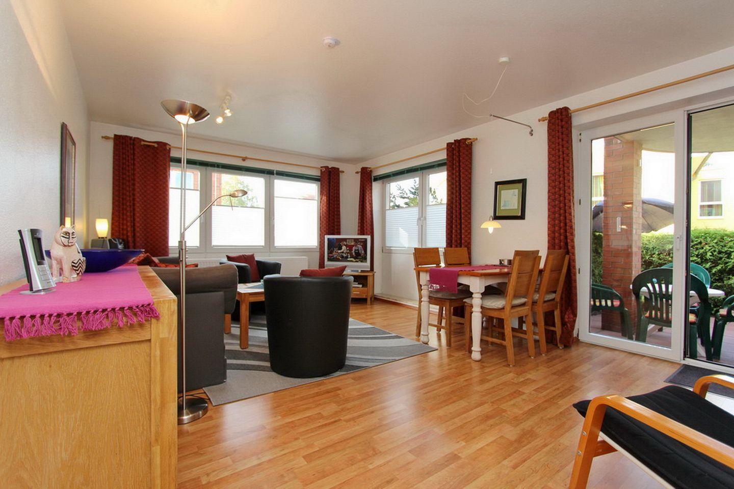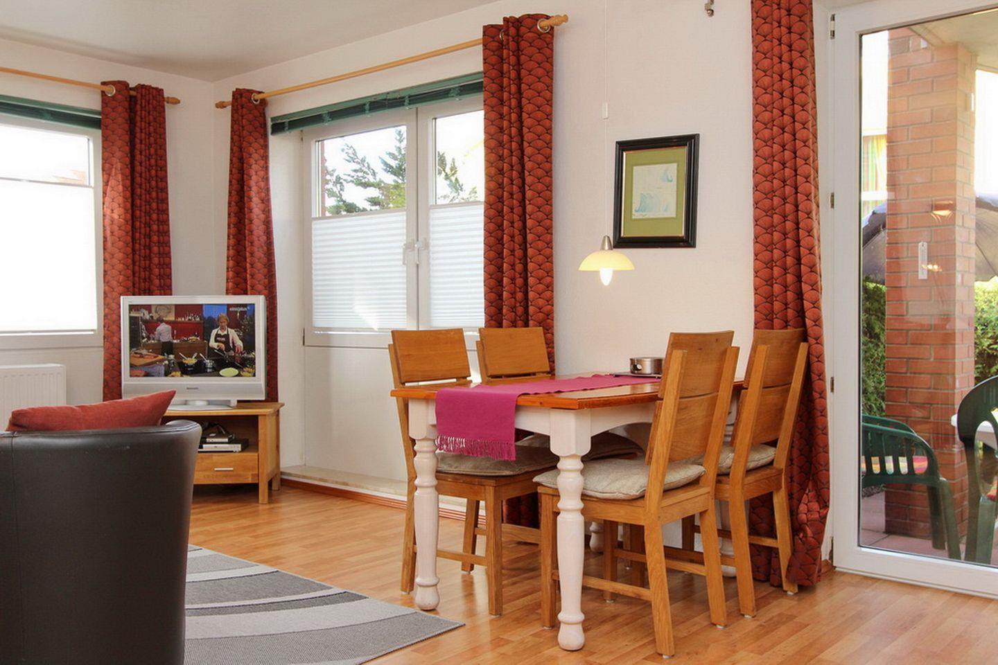 Durch den Flur gelangst du in den geräumigen Wohnraum, der hell und modern eingerichtet ist. Zur Ausstattung gehören u. a. ein DVD-Player, ein Flatscreen und eine Stereoanlage. Eine gemütliche Couch mit Schlaffunktion (160 x 200 cm) nebst zwei Sesseln lädt zum gemeinsamen Beisammensein ein. Der integrierte Essbereich ist mit seinem Mobiliar auf das freundliche Erscheinungsbild des Raumes abgestimmt.
