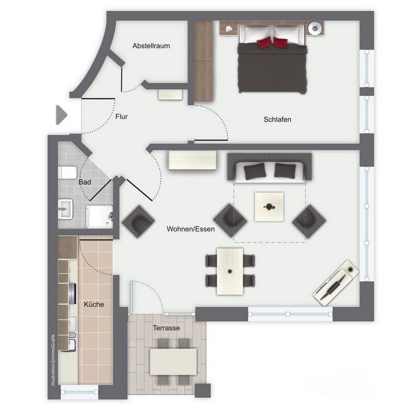 Die Küchenzeile ist separat und mit Kühlschrank und Gefrierfach, Mikrowelle, Spülmaschine und 4-Platten-Herd mit Backofen und vielem mehr ausgestattet. Darüber hinaus gehört zur Wohnung ein funktionelles Duschbad.