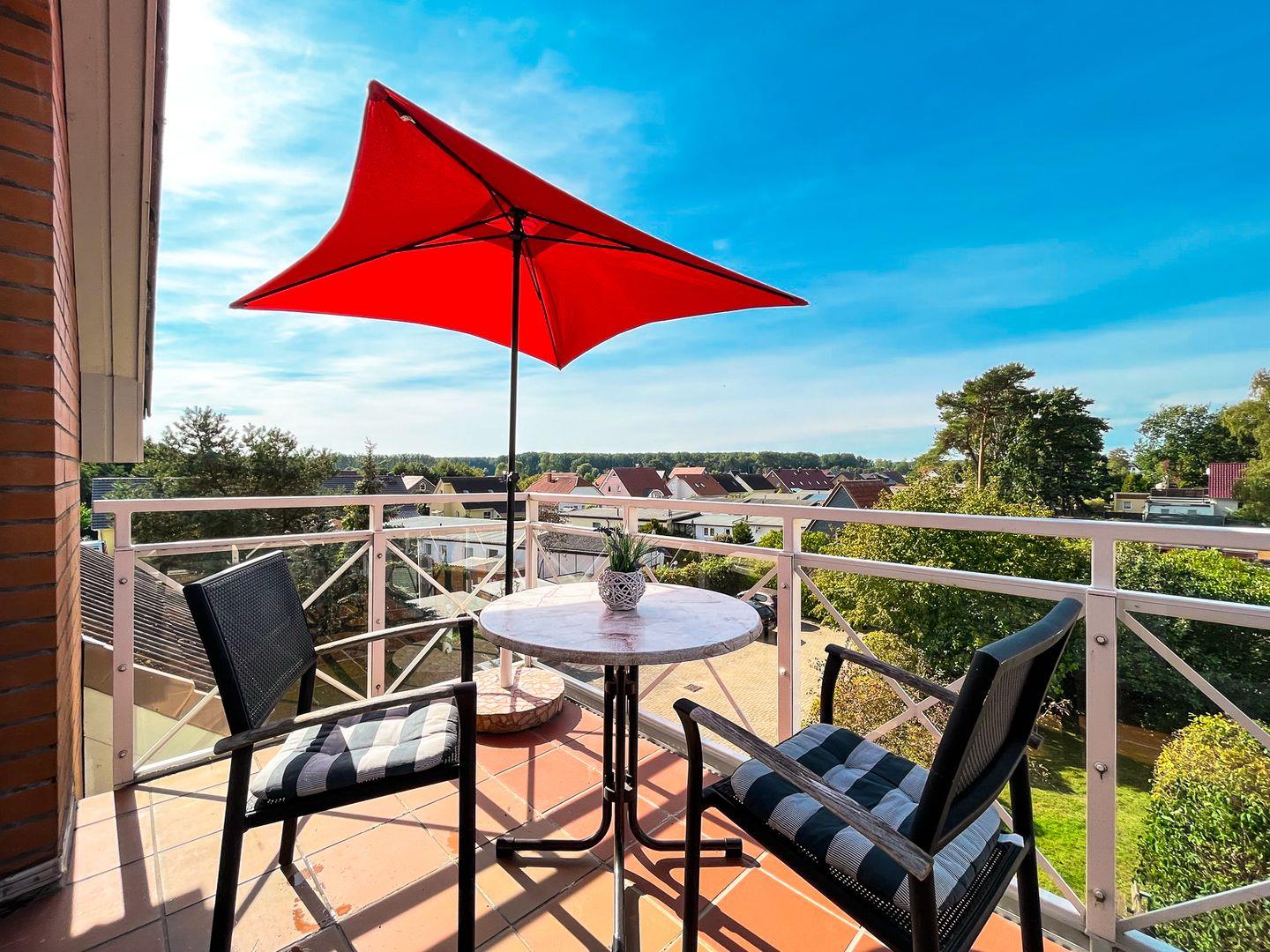 Deine Ferienwohnung befindet sich im 2. Obergeschoss und hat eine Größe von 56 m². Hier findest du ein Wohnzimmer mit Zugang zum Süd-West-Balkon, ein Schlafzimmer, eine separate Küche sowie das Duschbad vor. Die Entfernung zum Strand beträgt ca. 200 m.