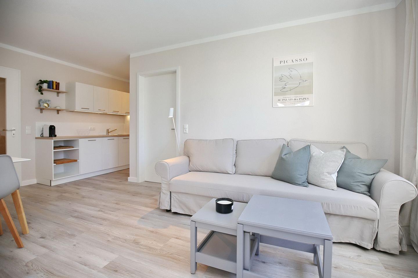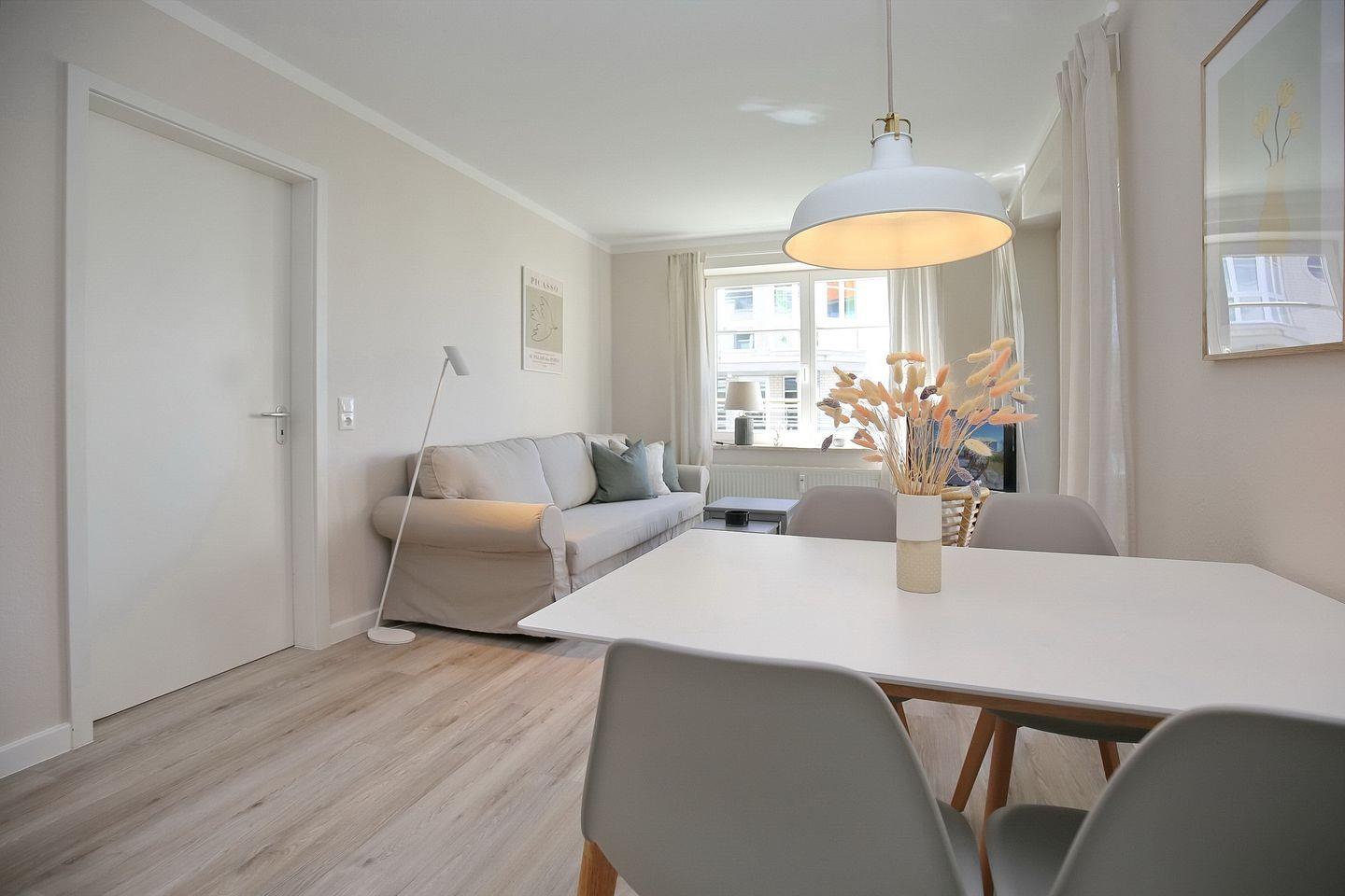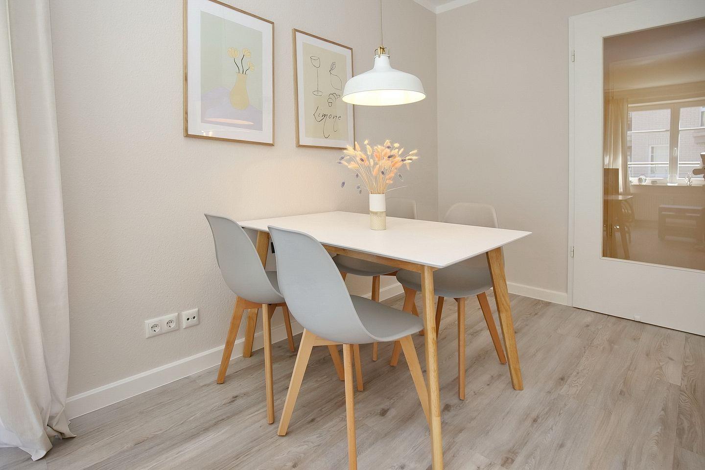 Die im skandinavischen Wohnstil eingerichtete Wohnung lädt dich mit den freundlichen Farben zum Entspannen und Genießen ein.