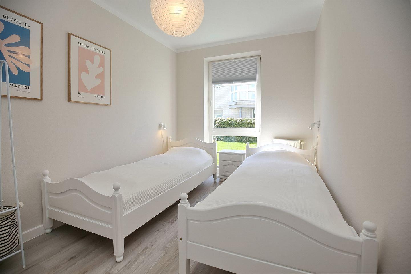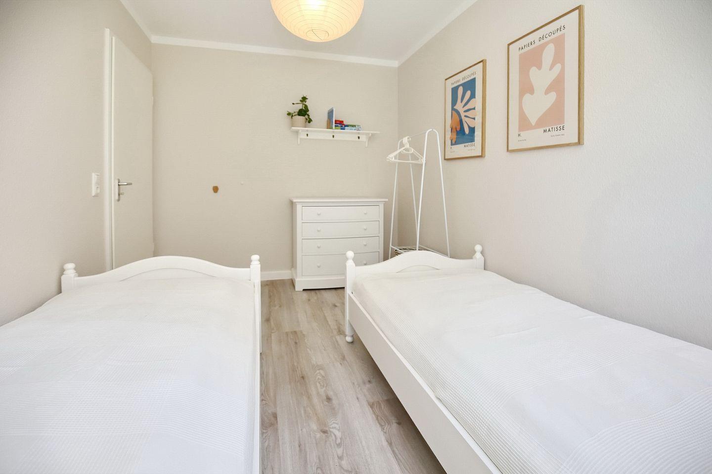 Im zweiten Schlafzimmer befinden sich zwei Einzelbetten (90 x 200 cm). In jedem Schlafzimmer steht dir ein Kleiderschrank/Kommode für deine Urlaubsgarderobe zur Verfügung.