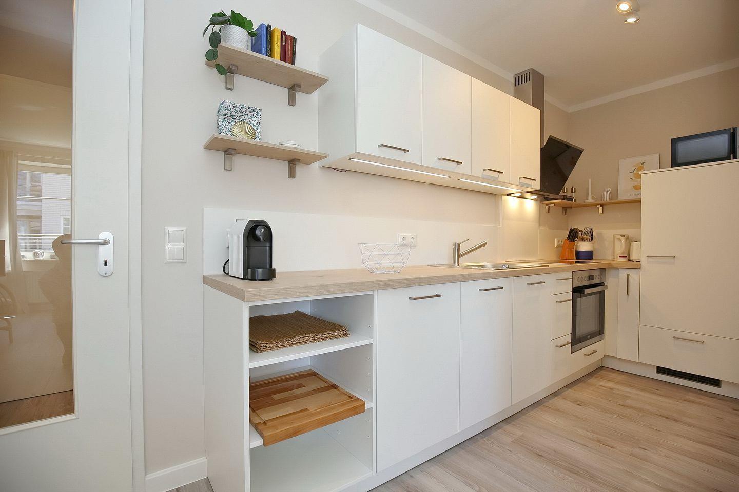 Die gut ausgestattete Küchenzeile mit Backofen, einem 4-Platten-Cerankochfeld, Geschirrspüler und einem Kühlschrank mit Gefrierfach grenzt an den Wohnbereich und ist offen gestaltet.