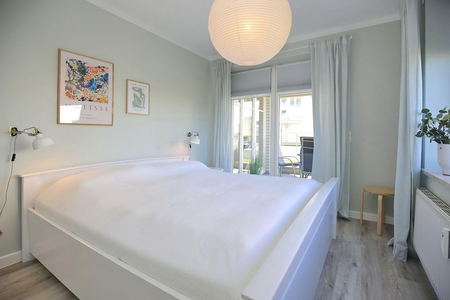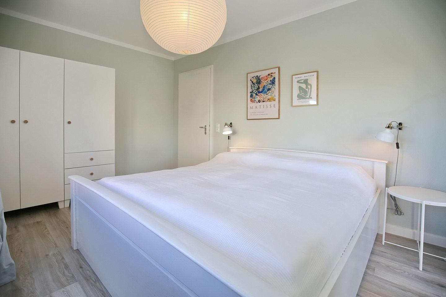 Beide Schlafzimmer sind hell und freundlich im skandinavischen Wohnstil eingerichtet. Das größere Schlafzimmer ist mit einem Doppelbett (2 x 90 x 200 cm) ausgestattet, auch hier ist der Boden in Holzoptik gehalten. Es kombiniert helles, klares Weiß mit einem pastelligen Grün. Damit wird es zum perfekten Rückzugsort, in dem du erholsam schlafen oder dich ausgiebig einem guten Buch widmen kannst.