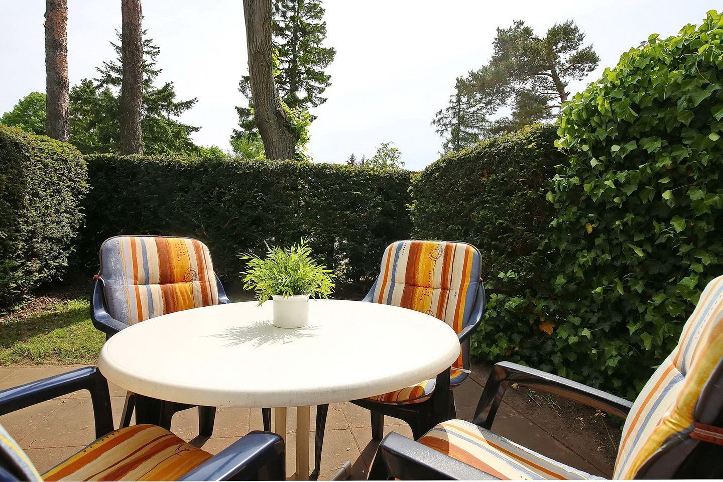 Die mit einer Hecke umgebene, teilüberdachte Terrasse lädt zum entspannten Aufenthalt im Freien ein. Terrassenmöbel mit Sonnenschirm und einem Elektrogrill stehen dir hier zur Verfügung.