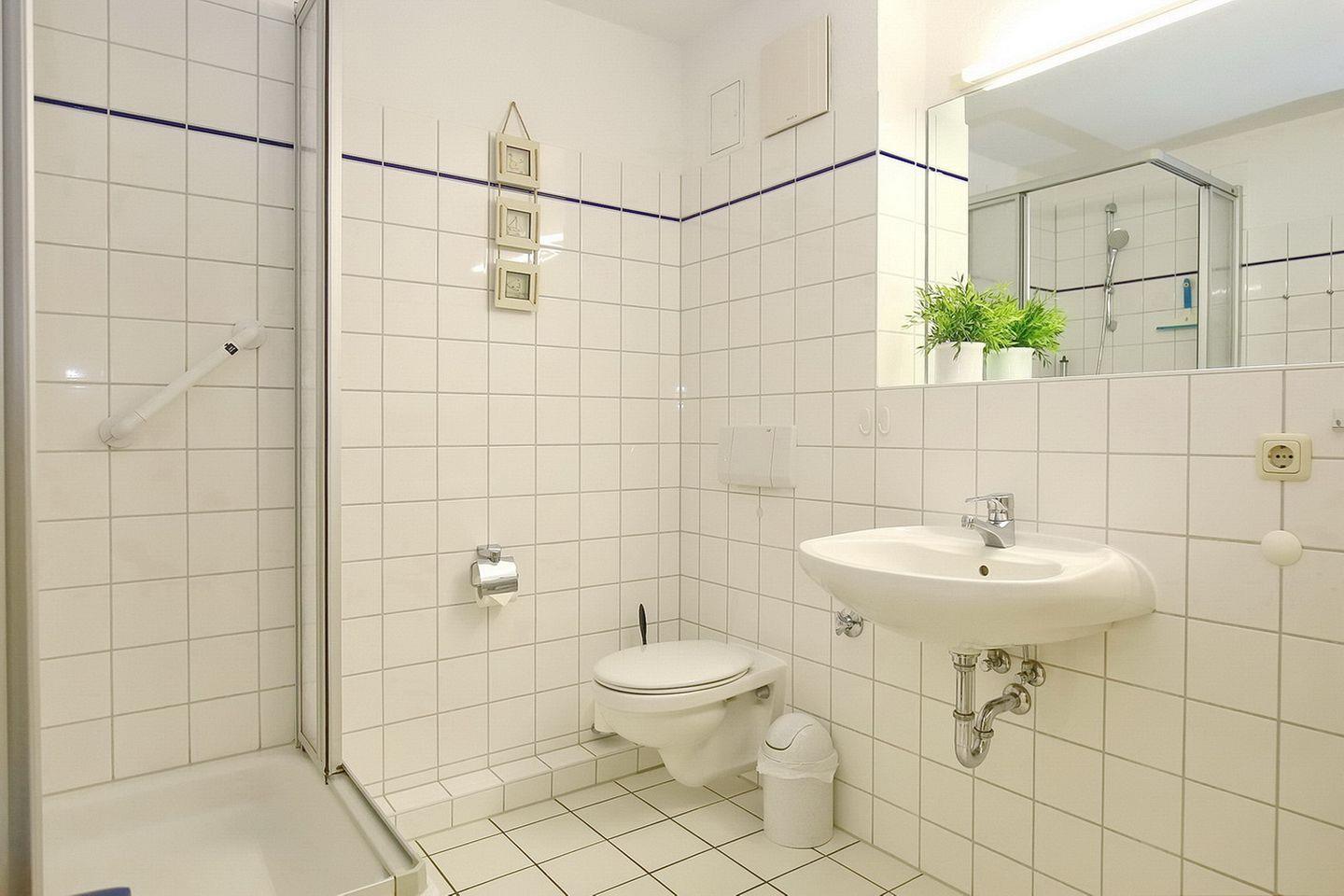 Ein gefliestes Duschbad ist vorhanden. Ein Bügelbrett, Bügeleisen und eine Mikrowelle finden sich im Abstellraum. Fahrräder können am Fahrradständer am Haus oder im Keller abgestellt werden. In dieser Nichtraucherwohnung sind maximal zwei Haustiere erlaubt.
