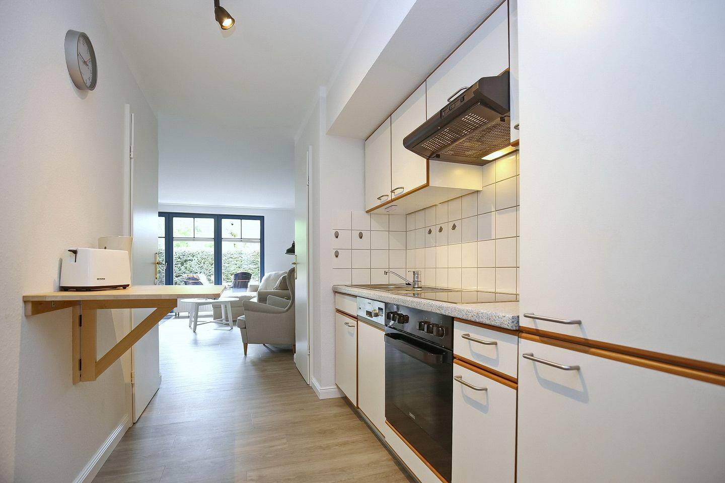 Zur integrierten Küchenzeile gehören ein 4-Plattenkochfeld mit Backofen, ein Geschirrspüler, ein Kühlschrank mit Gefrierfach sowie weitere Utensilien für die Zubereitung von Mahlzeiten. In der gesamten Wohnung, mit Ausnahme vom Badezimmer und der Abstellkammer, ist ein moderner Vinylbelag ausgelegt.