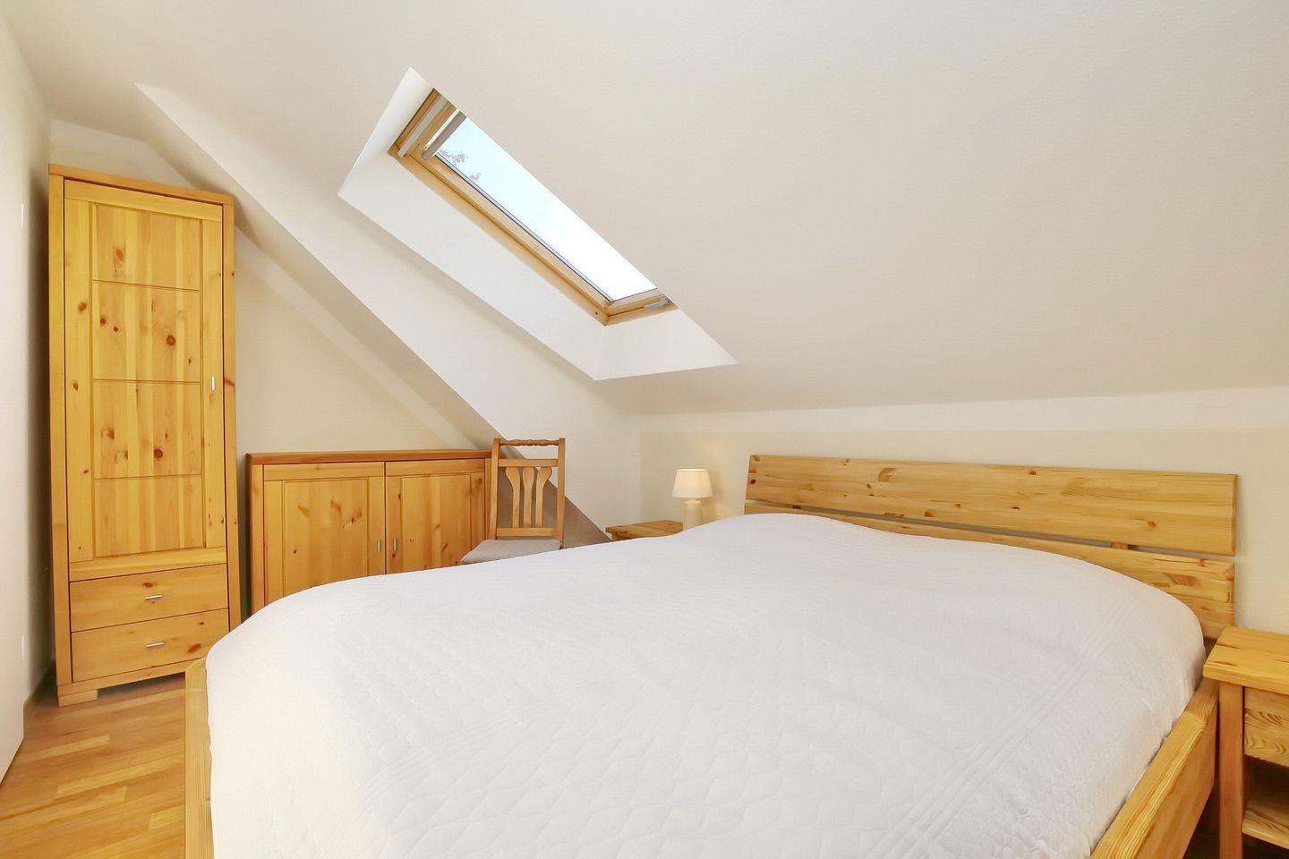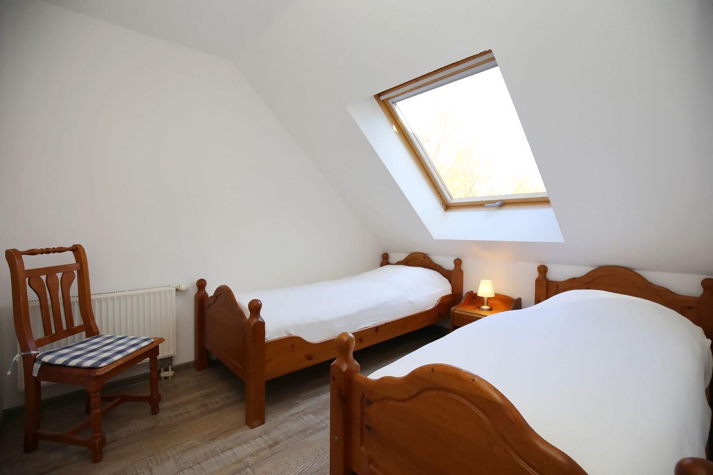 Im Schlafzimmer im 1. OG findest du neben zwei Einzelbetten (2 x 90 x 200 cm) auch einen Kleiderschrank vor. Die beiden Schlafzimmer im Obergeschoss sind mit jeweils einem Doppelbett (2 x 90 x 200 cm und 2 x 80 x 200 cm) und einem Kleiderschrank ausgestattet. Die Fenster werden durch Rollos verdunkelt. In den Zimmern ist Laminat verlegt.