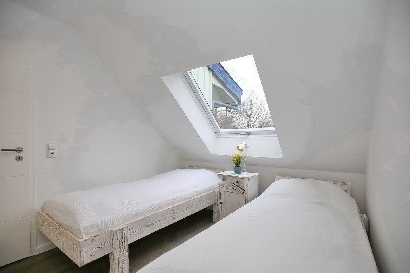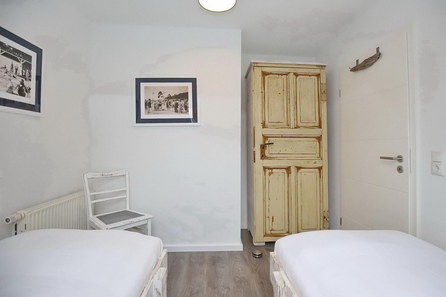 Im Schlafzimmer im 1. OG findest du neben zwei Einzelbetten (2 x 90 x 200 cm) auch einen Kleiderschrank. Ein Verdunklungsrollo sorgt für erholsamen Schlaf. In den beiden Schlafzimmern im Obergeschoss befinden sich jeweils ein Doppelbett (2 x 90 x 200 cm und 2 x 80 x 200 cm) und ein Kleiderschrank. Die Fenster werden durch Rollos verdunkelt.