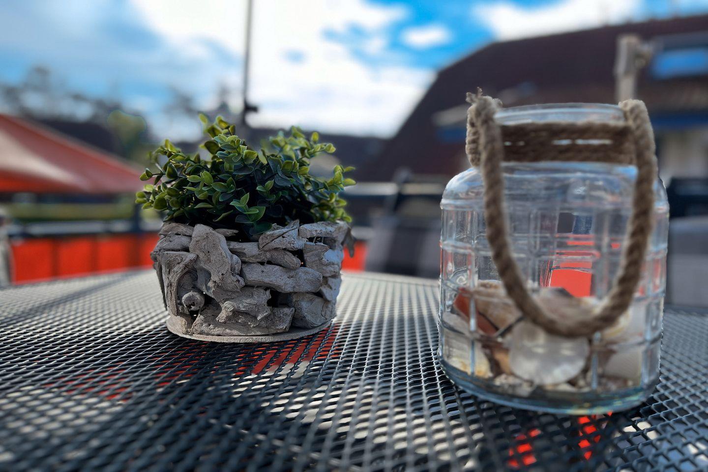 Auf den möblierten Balkon gelangst du vom Wohnzimmer aus. Ein Sofa und ein Essbereich sind im Wohnbereich platziert. Für den Zeitvertreib sorgen eine Stereoanlage und ein Flachbild-TV.
