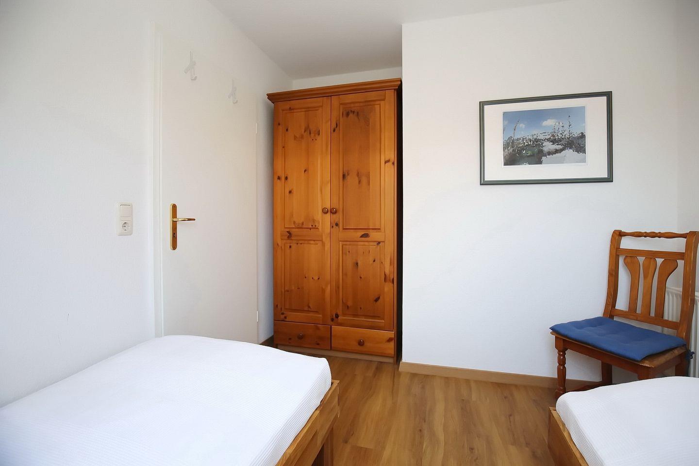 Hier findest du zwei Schlafzimmer mit zwei Doppelbetten (2 x 90 x 200 cm) und zwei Kleiderschränken. Im ersten Obergeschoss liegt ein weiteres Schlafzimmer mit zwei Einzelbetten (90 x 200 cm). Rollos in allen Schlafzimmern dienen als Verdunklungsmöglichkeit. Die gesamte Wohnung ist mit Teppichboden ausgelegt.