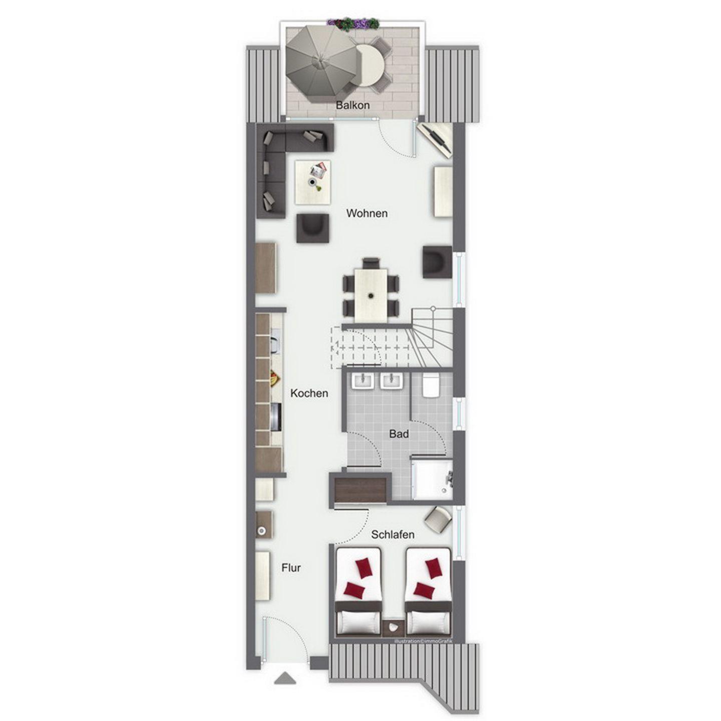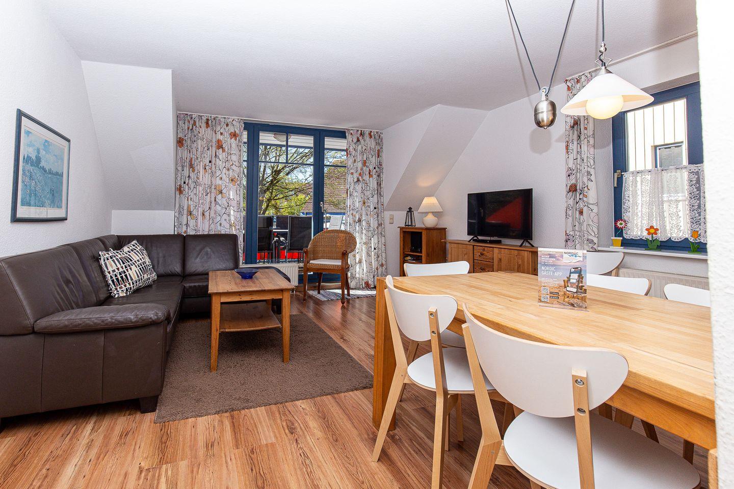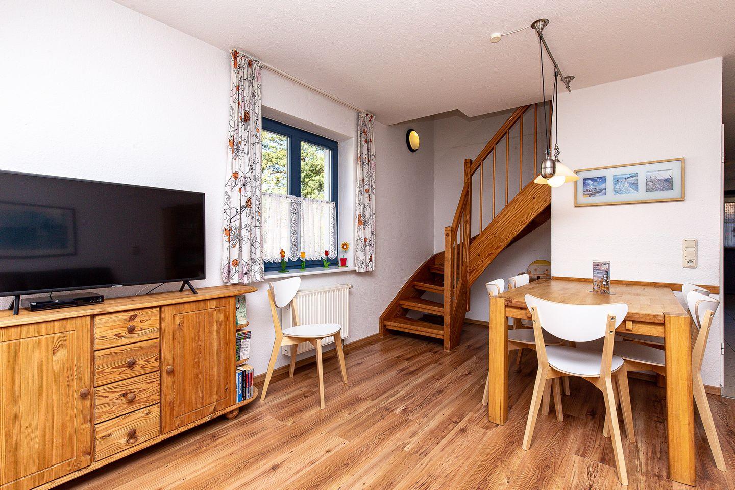Dein Wohnzimmer auf der unteren Ebene ist mit einer gemütlichen Sitzecke und einem großen Essbereich für sechs Personen ausgestattet. Ein Kinderhochstuhl steht für die kleinen Gäste zur Verfügung. Für Kurzweil sorgen ein Flachbild-TV, eine HiFi-Anlage, ein DVD-Player sowie eine Auswahl an Büchern. Über eine innenliegende Treppe erreichst du die beiden Schlafzimmer im Dachgeschoss.