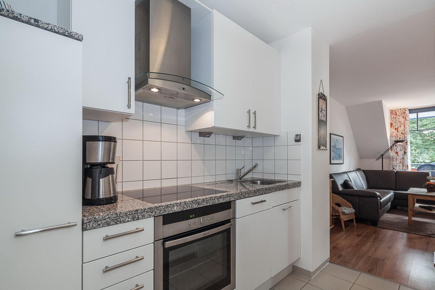 Die integrierte moderne Küchenzeile ist vollständig ausgestattet mit Geschirrspüler, Cerankochfeld, Backofen und Kühlschrank mit Gefrierfach. Der Küchenbereich ist gefliest. Im gesamten unteren Wohn- und Schlafbereich ist der Bodenbelag Laminat.