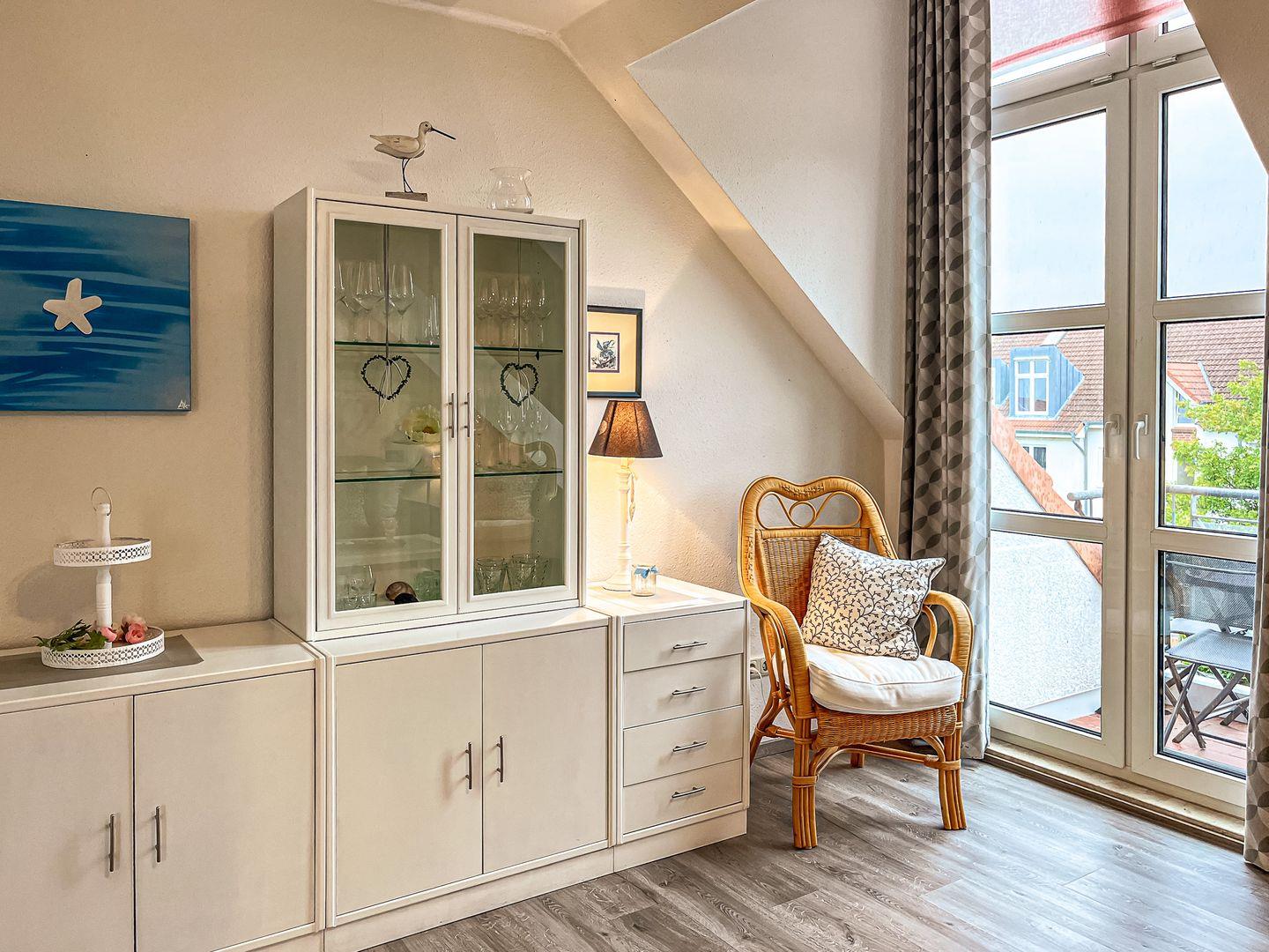 Den Balkon erreichst du vom Wohnzimmer und ist möbliert. Im Wohnbereich findest du eine Couchgarnitur und eine Essecke. Für Unterhaltung sorgen ein Flachbild-TV, ein DVD-Player, eine Mini-Stereoanlage mit Bluetooth und USB-Anschluss.