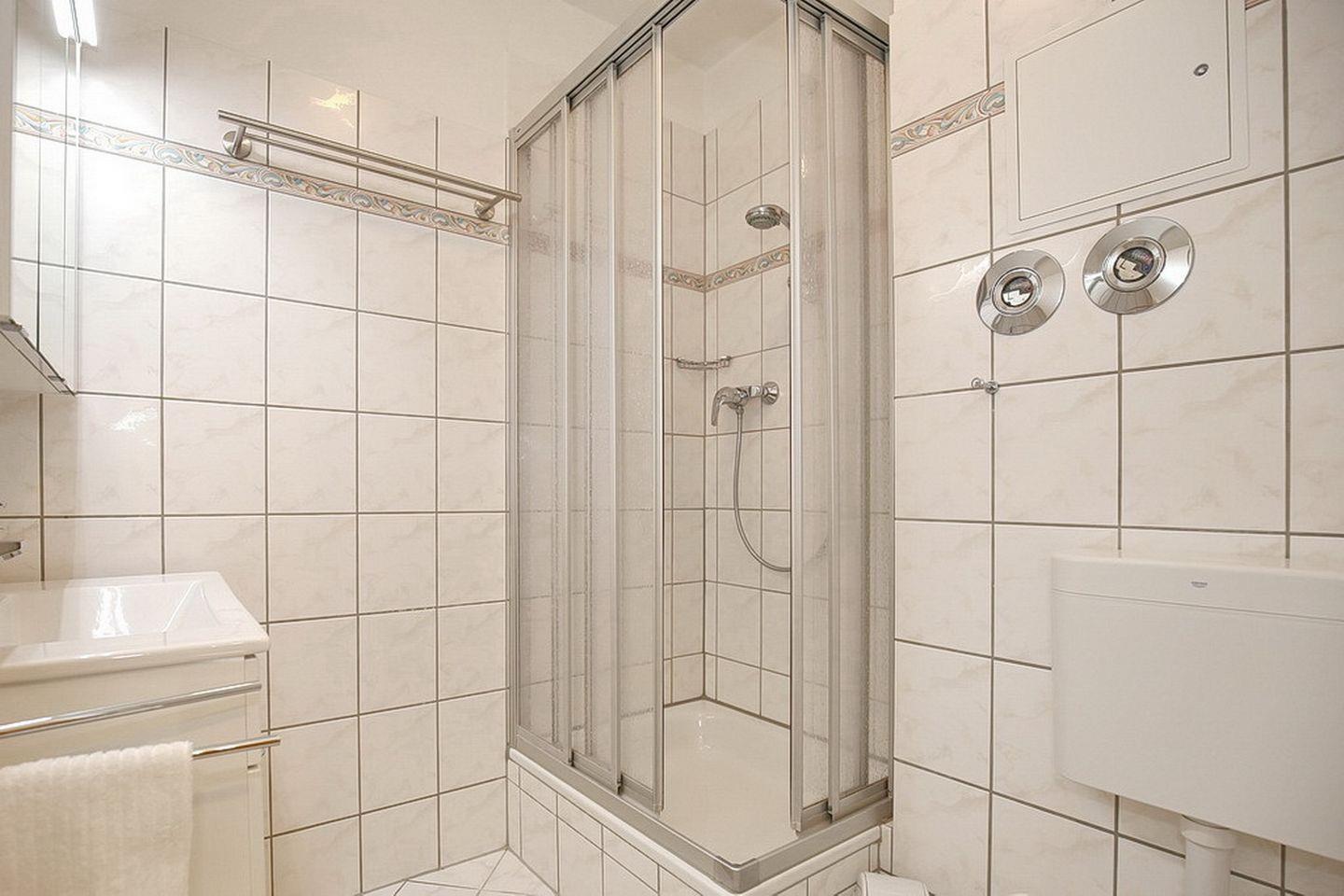 Das Duschbad ist hell gefliest. Als Bodenbelag wurde in der Ferienwohnung Designbelag gewählt.