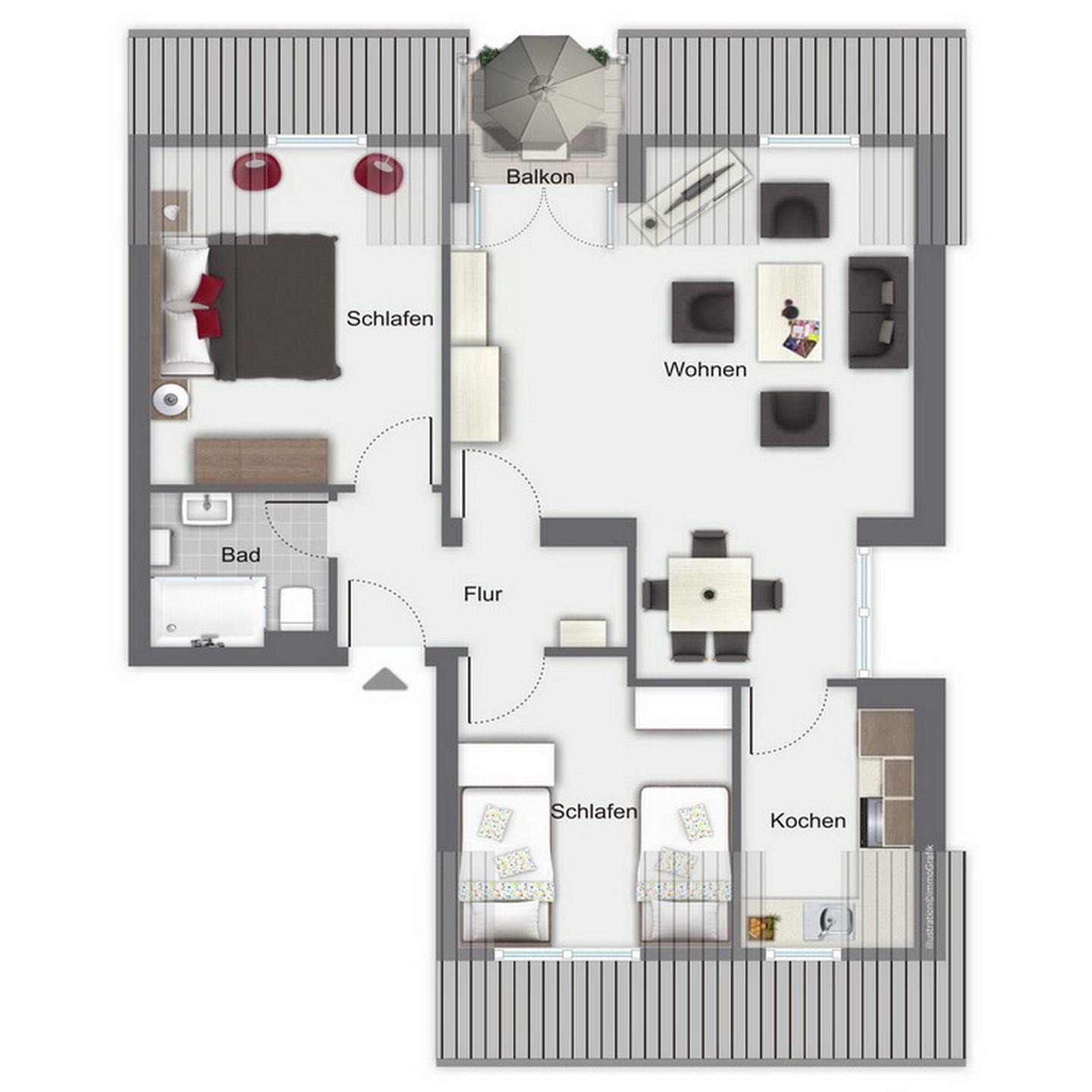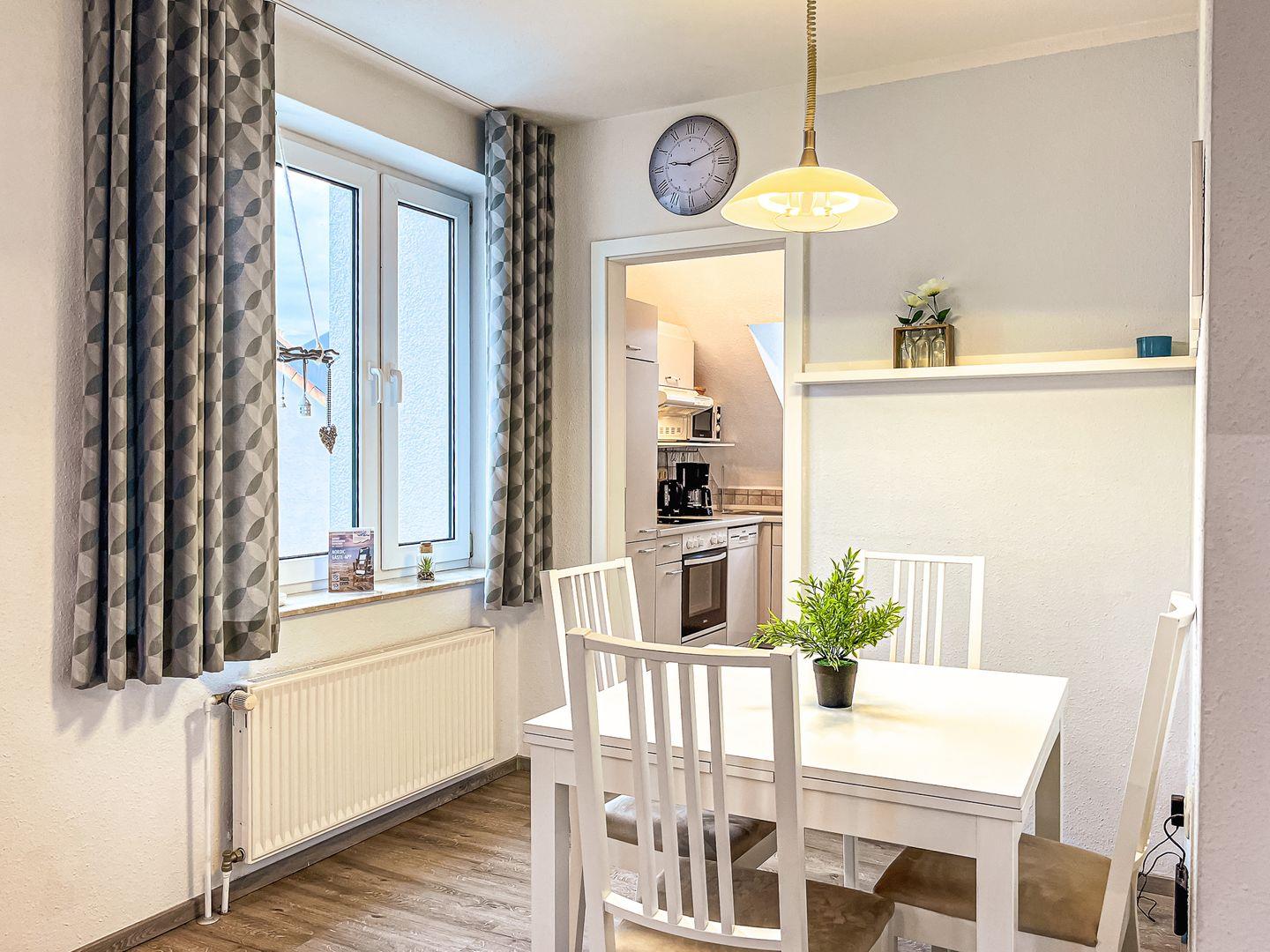 Die 3 Zimmerwohnung Nr. 68 (DG) der Ferienwohnanlage Sünnslag verfügt über 1 Wohnzimmer mit Küchenzeile sowie 2 separate Schlafräume mit max. 4 Schlafplätzen. Der Balkon liegt in Richtung Südost. WLAN (ohne Gewähr) inklusive.