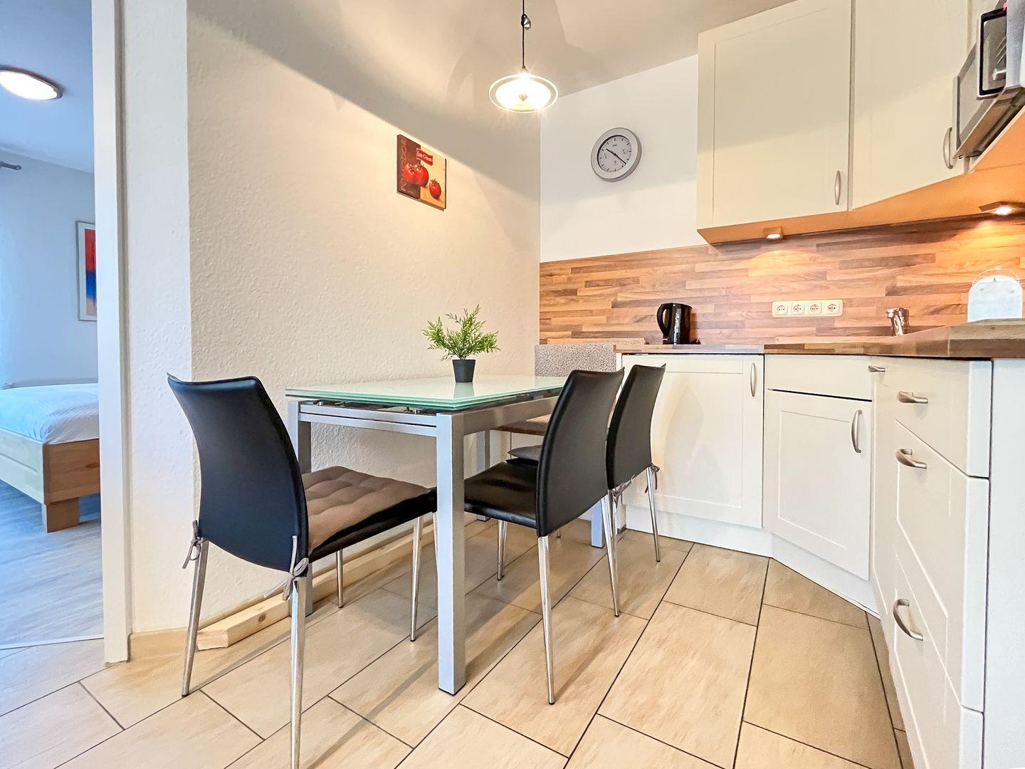 Die Küchenzeile befindet sich in unmittelbarer Nähe zum Essbereich. Sie ist vollständig ausgestattet mit Kühlschrank mit Gefrierfach, Geschirrspüler, Mikrowelle und einem 4-Platten-Cerankochfeld.