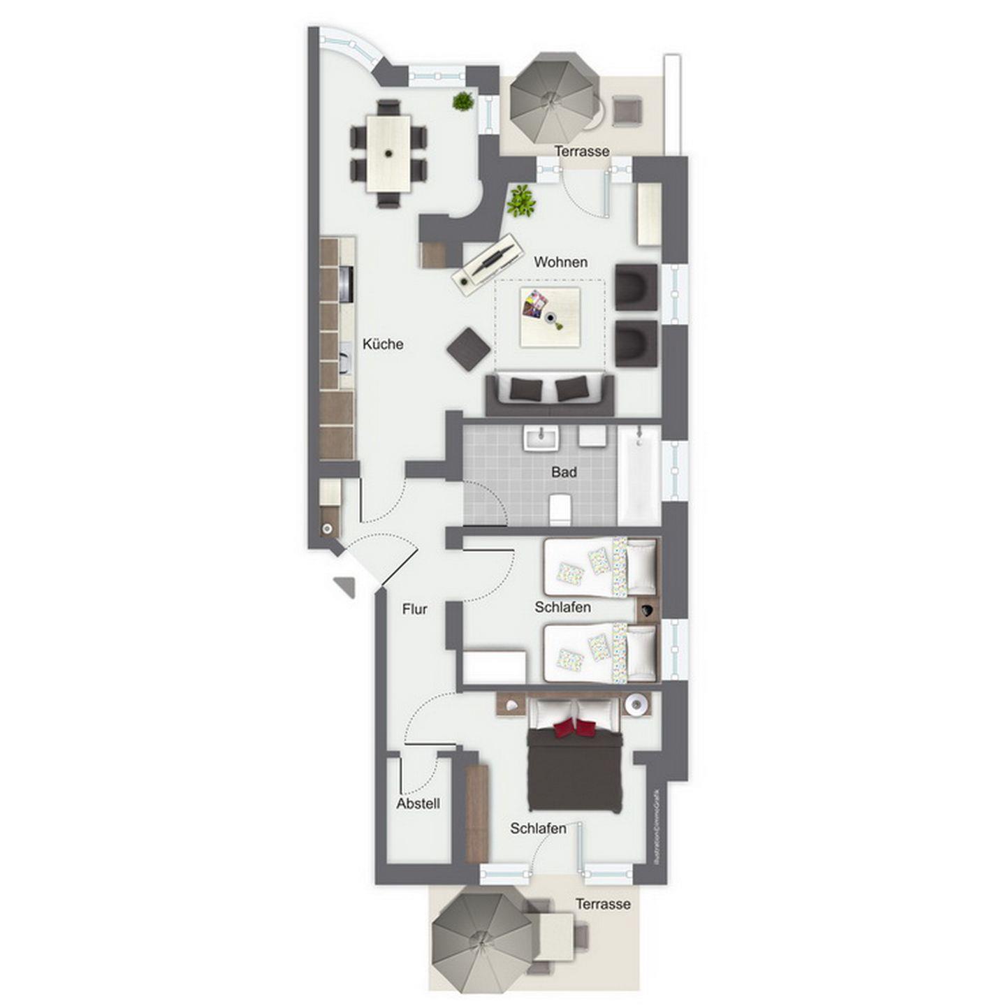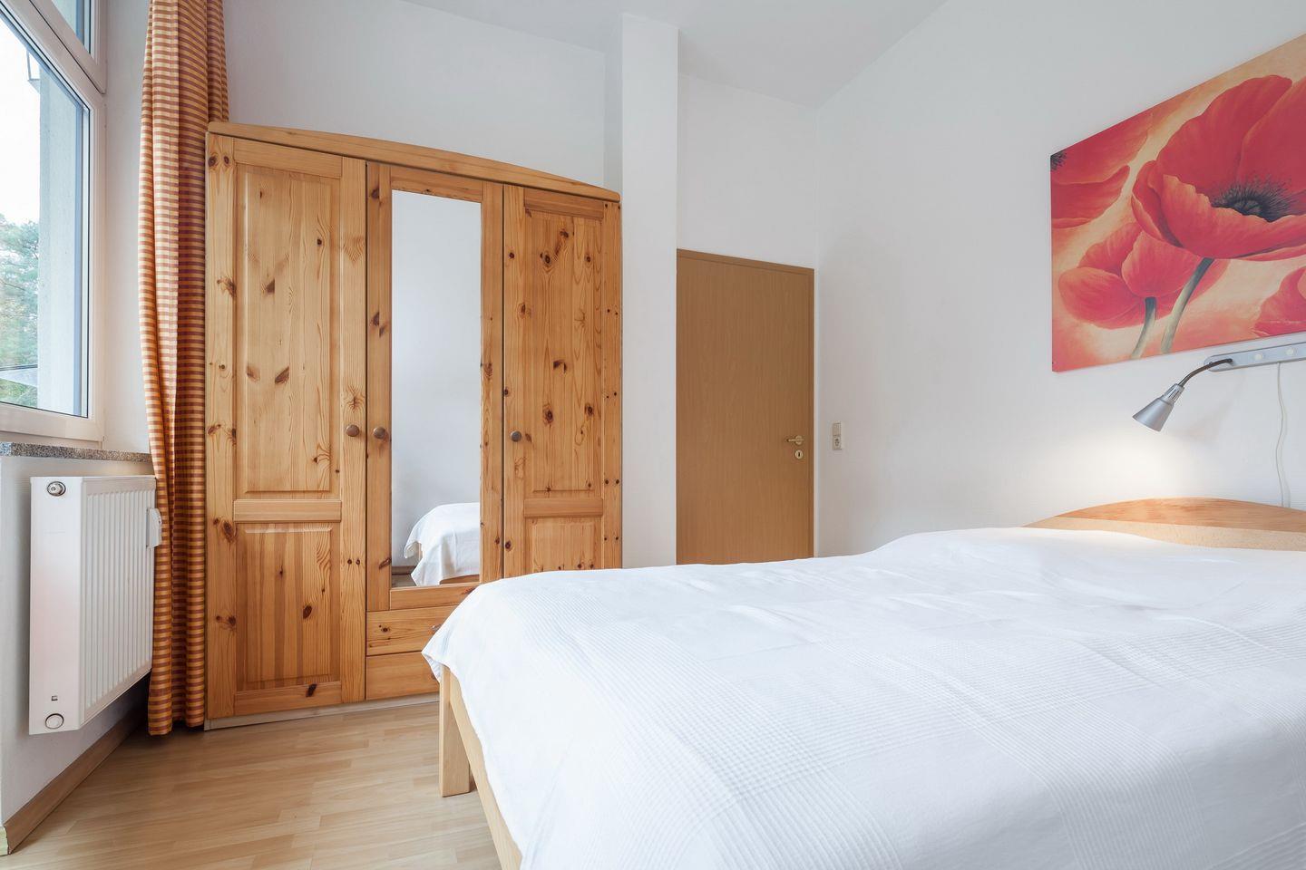 In einem Schlafzimmer befindet sich ein Doppelbett (140 cm x 200 cm mit einer durchgehenden Matratze). Der Südbalkon dieser Wohnung ist von diesem Schlafzimmer aus zu erreichen. Im zweiten Schlafzimmer sind zwei Einzelbetten (je 90 x 200 cm).