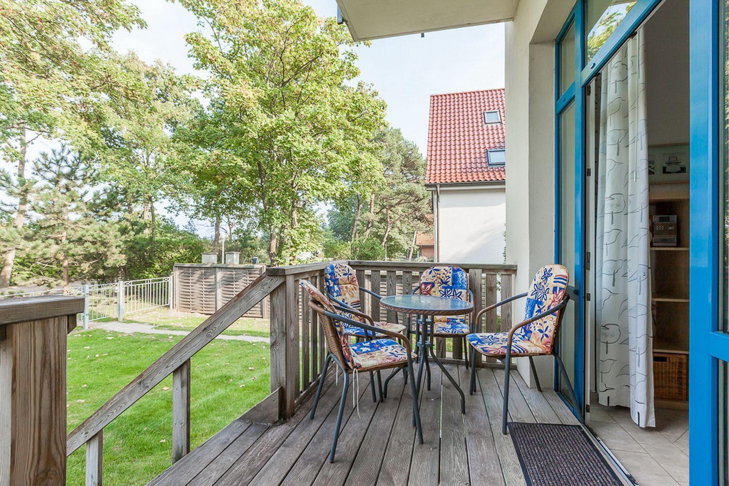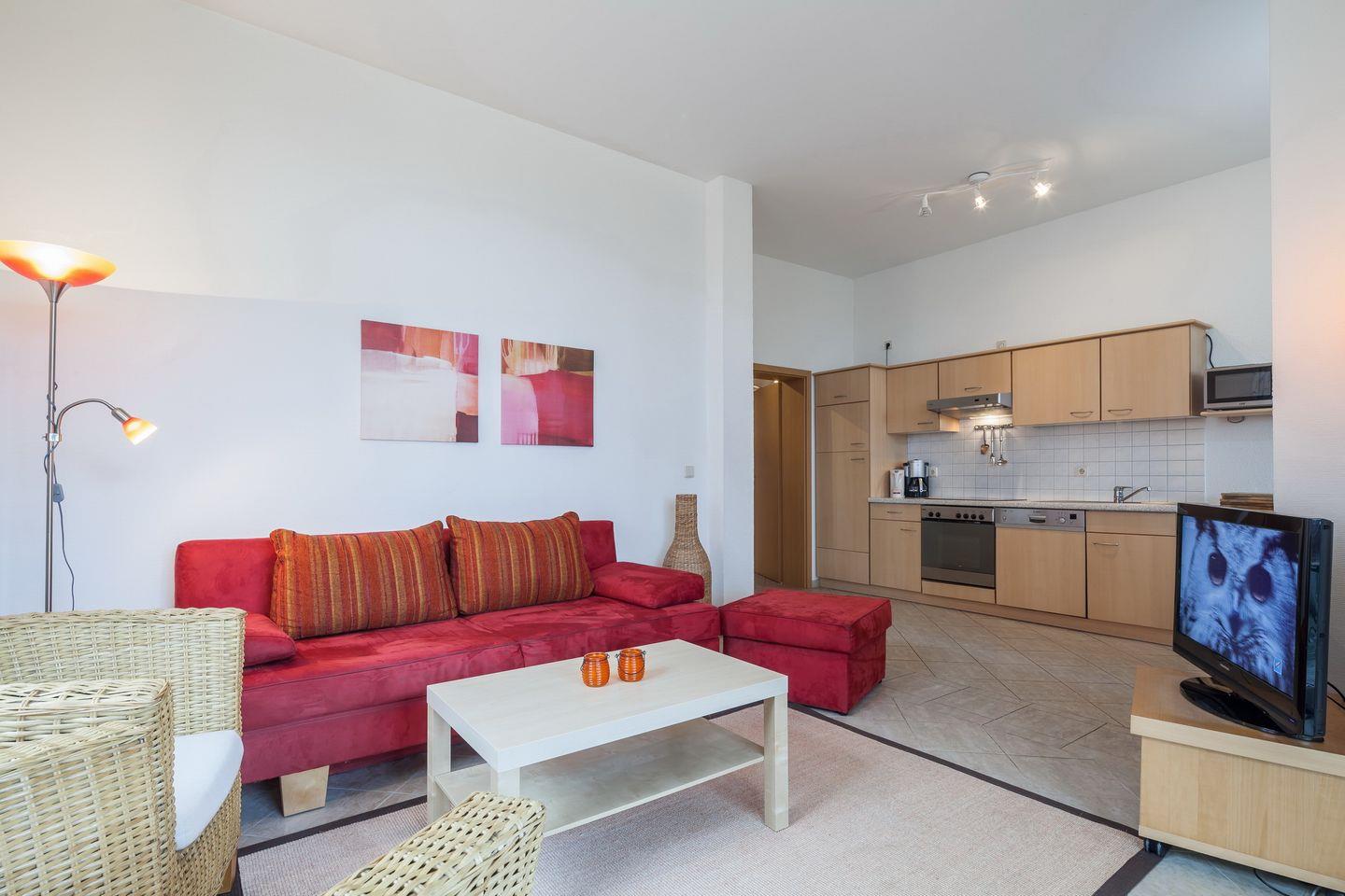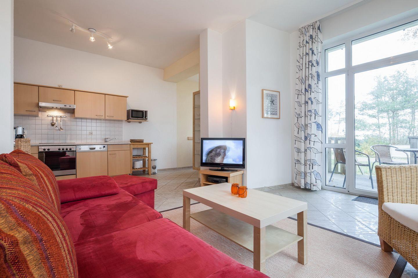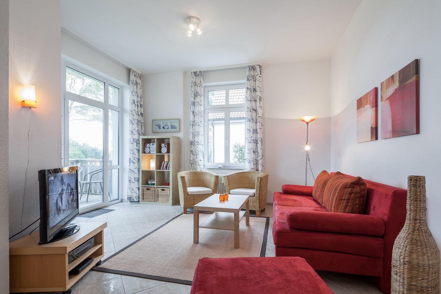Vom Wohnzimmer aus, das mit einer Doppelschlafcouch (160 cm x 200 cm) für 2 Personen, einer Stereoanlage und einem Flachbild-TV ausgestattet ist, hast du einen schönen Blick auf die grüne Strandpromenade. Du gelangst direkt von hier aus auf den Balkon in Richtung Seeseite. Über eine Treppe gelangst du auf das Rasengrundstück direkt am Haus.