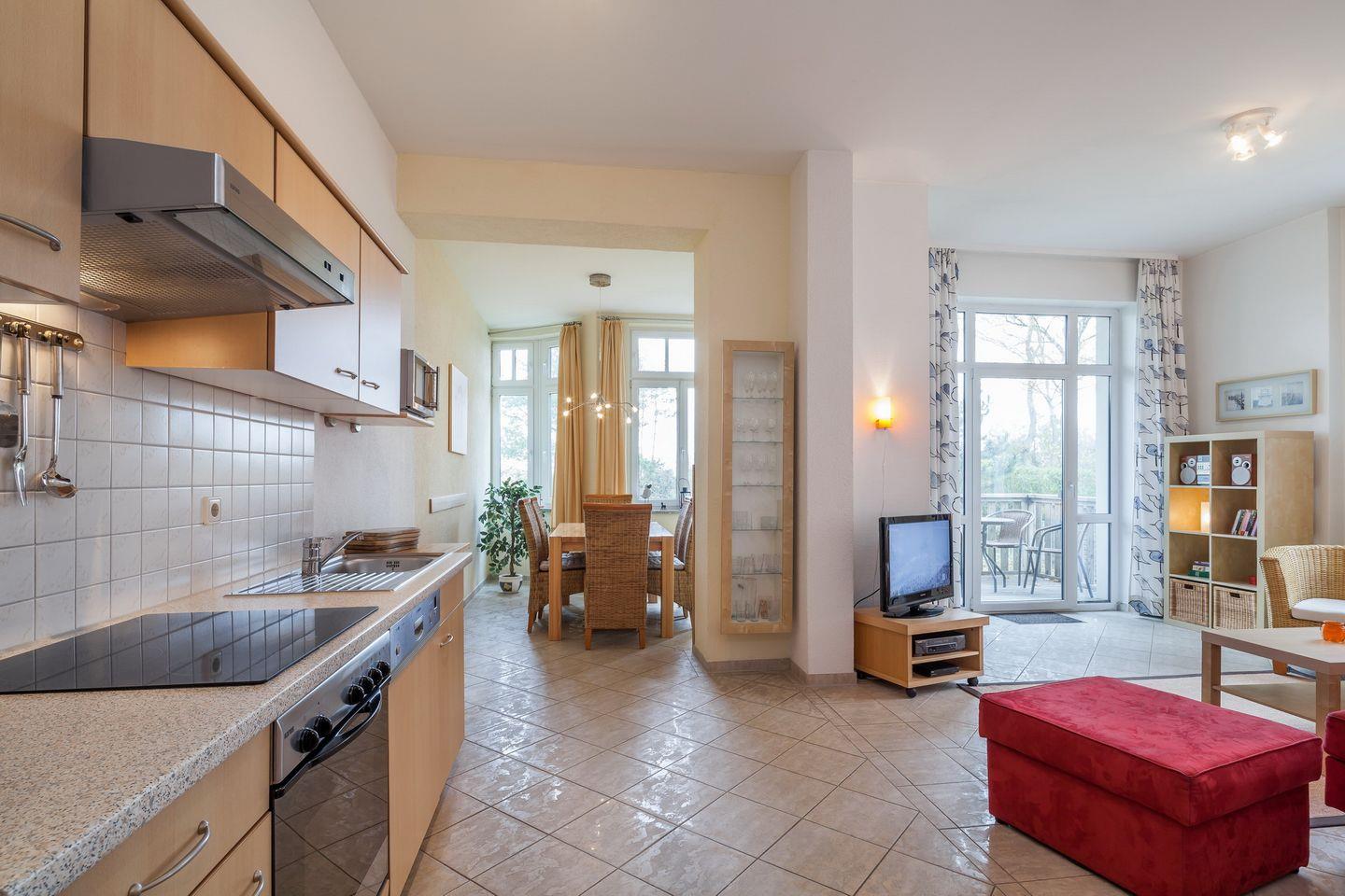 Die Küchenzeile, unter anderem mit Geschirrspüler, Mikrowelle, Cerankochfeld und Backofen, sowie einem Kühlschrank mit Gefrierfach ausgestattet, ist im Wohnzimmer integriert. Der großzügig und modern gestaltete Essbereich im Erker bietet 6 Personen Platz zum Essen.