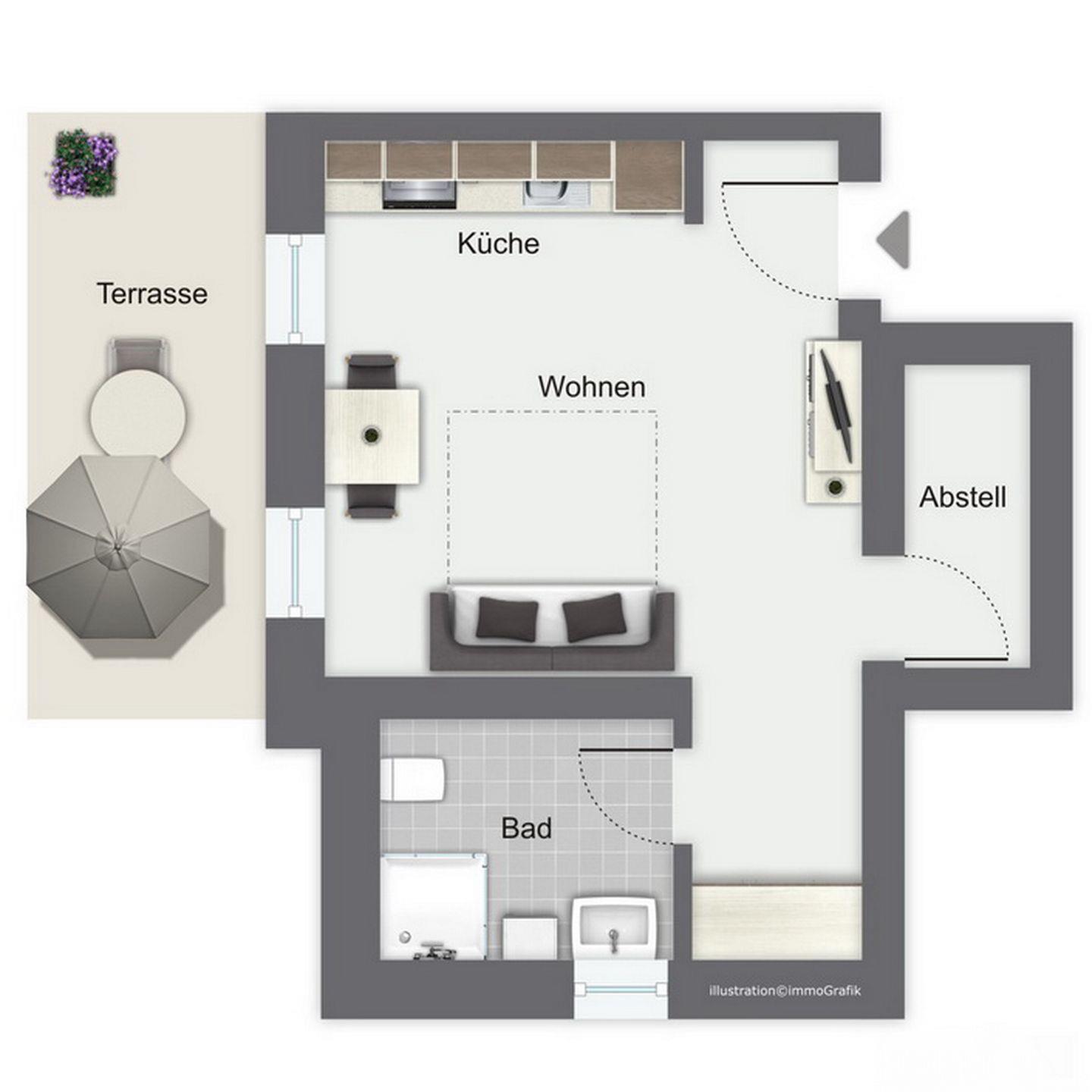 Die Wohnung hat ein Duschbad. Die gesamte Wohnung ist gefliest. In dieser Nichtraucherwohnung sind maximal zwei Haustiere gestattet.