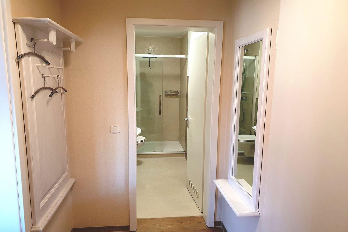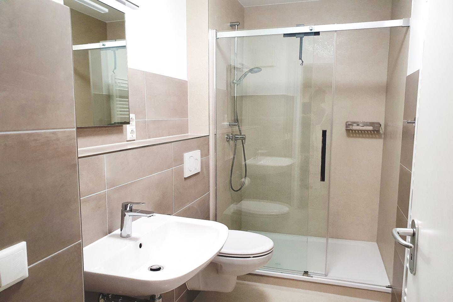 Das neu gestaltete, helle Duschbad ist mit einem großzügigen Duschbereich mit flachem Einstieg, Waschbecken, WC und einer Handtuchheizung ausgestattet.