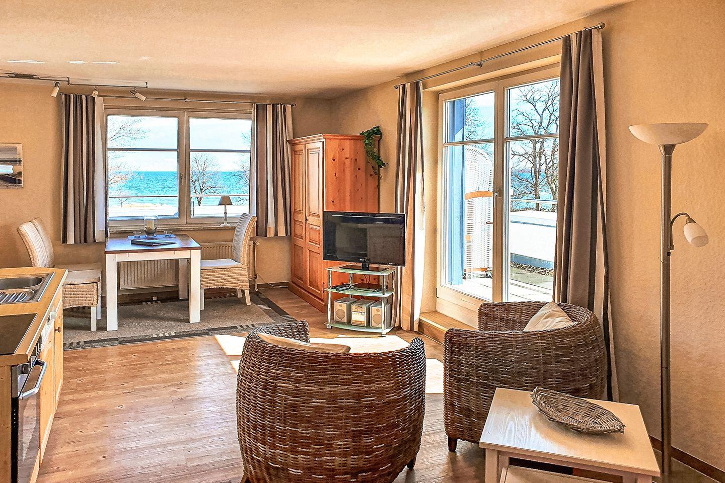 Die möblierte Dachterrasse mit eigenem Strandkorb und herrlichem Seeblick erreichst du über das Wohnzimmer. Lichtdurchflutet empfängt dich der Wohn-Essbereich mit Schlafcouch (1,50 x 200 cm) und ein Esstisch am Fenster, so dass du bei deinen Mahlzeiten immer den Seeblick genießen kannst. Zur Unterhaltung dienen ein Flachbild-TV (32“ LCD-Kabelfernseher), ein DVD-Player und eine Stereoanlage mit CD-Teil.