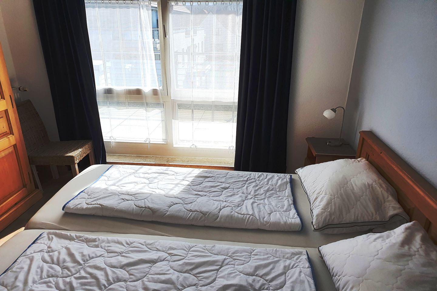 Im Schlafzimmer bietet ein bequemes Doppelbett (2x90x200 cm) mit Kaltschaummatratzen und verstellbaren Lattenrosten Liegekomfort. Deine mitgebrachte Garderobe kannst du im Kleiderschrank verstauen. Die Fenster werden mit Vorhängen abgedunkelt.