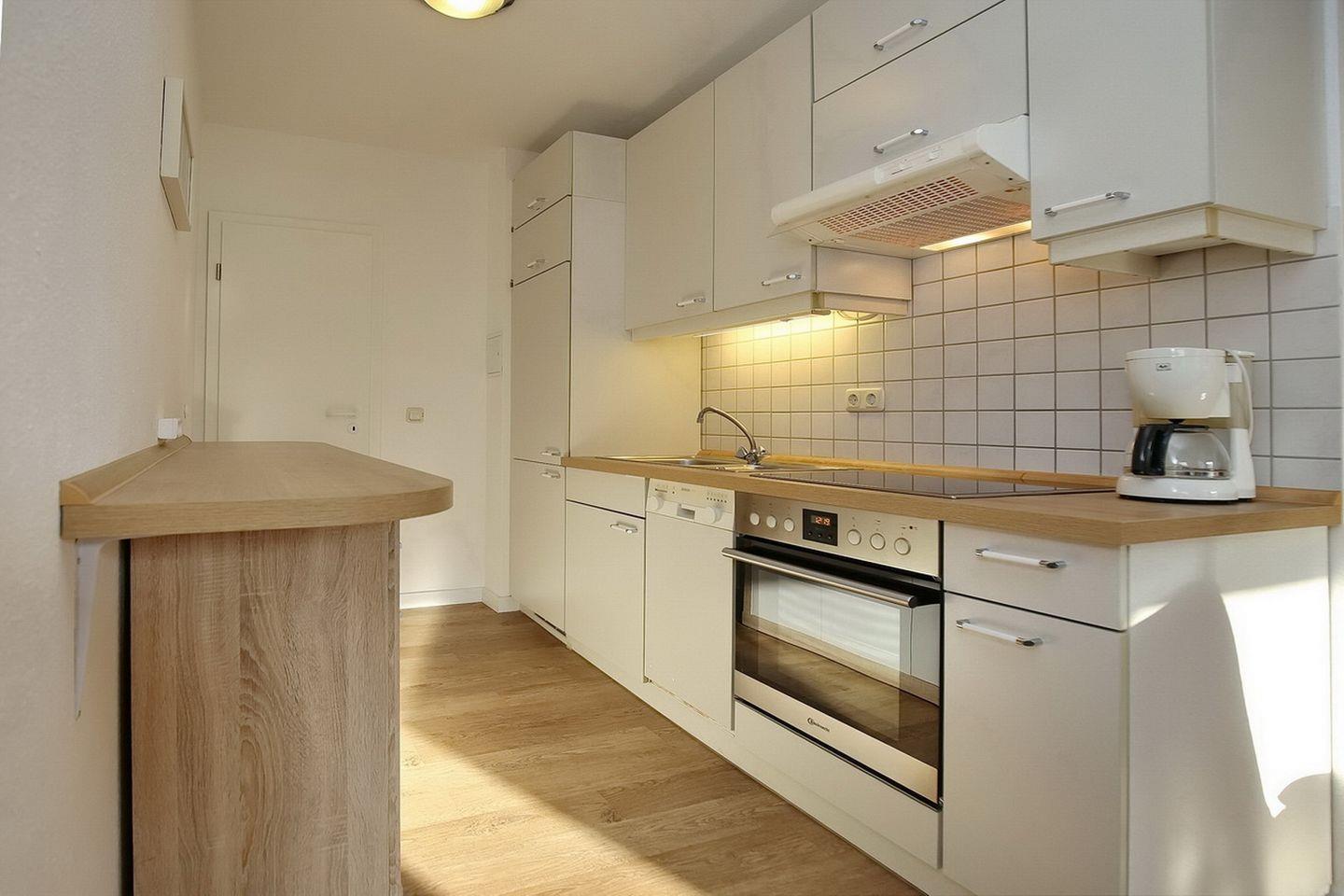Die im Wohnbereich integrierte Küchenzeile ist voll ausgestattet mit einer Mikrowelle, einem Cerankochfeld mit Backofen, einem Kühlschrank mit Gefrierfach sowie einem Geschirrspüler. Für die kleinen Gäste stehen ein Kinderreisebett und ein Kinderhochstuhl kostenfrei bereit.
