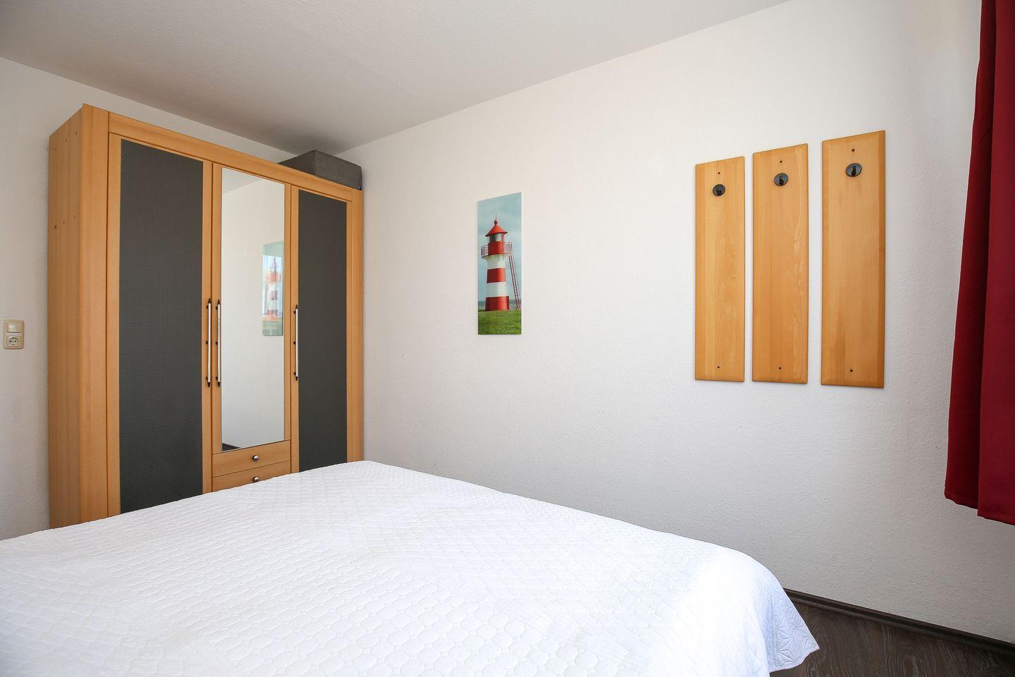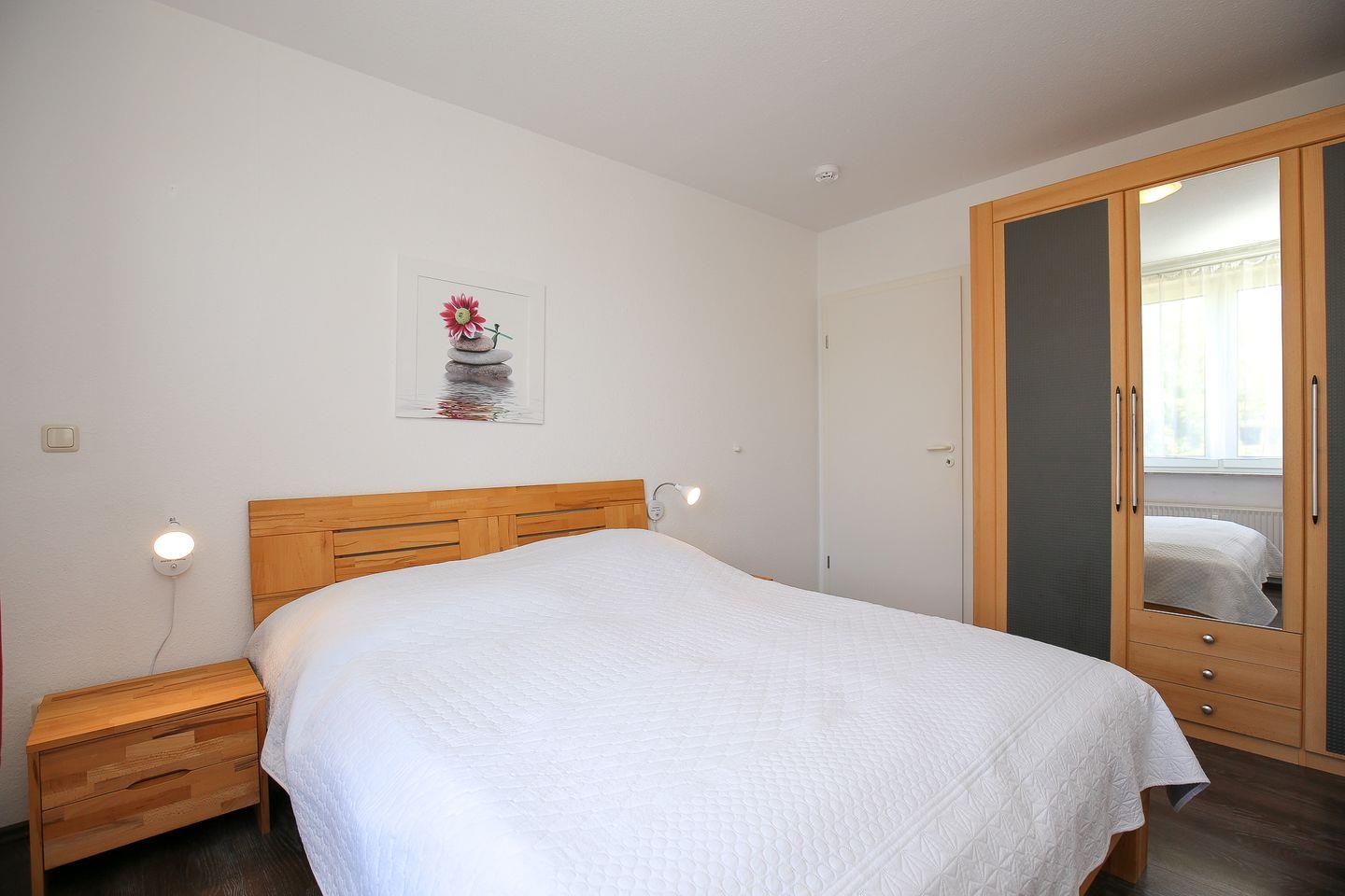 Für einen erholsamen Schlaf erwartet dich im Schlafzimmer ein Doppelbett (2 x 80 x 200 cm). Der große Kleiderschrank bietet viel Stauraum für deine mitgebrachte Garderobe. Im Schlafzimmer befindet sich ein Radio mit Weckfunktion. Das Fenster wird mit Vorhängen abgedunkelt. Der Bodenbelag im Wohn- und Schlafbereich ist Laminat.