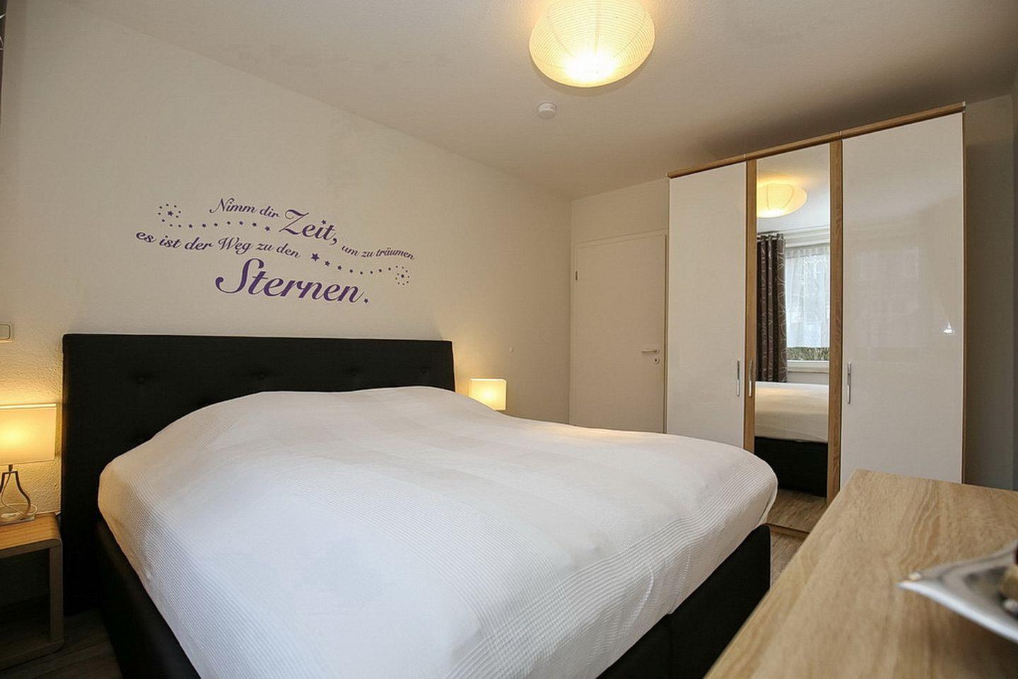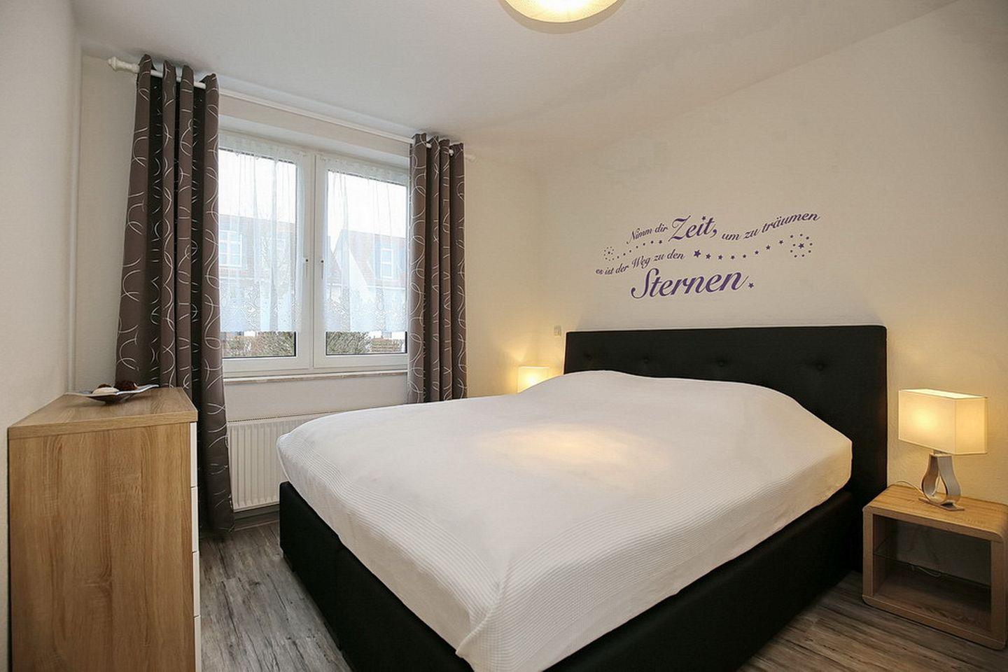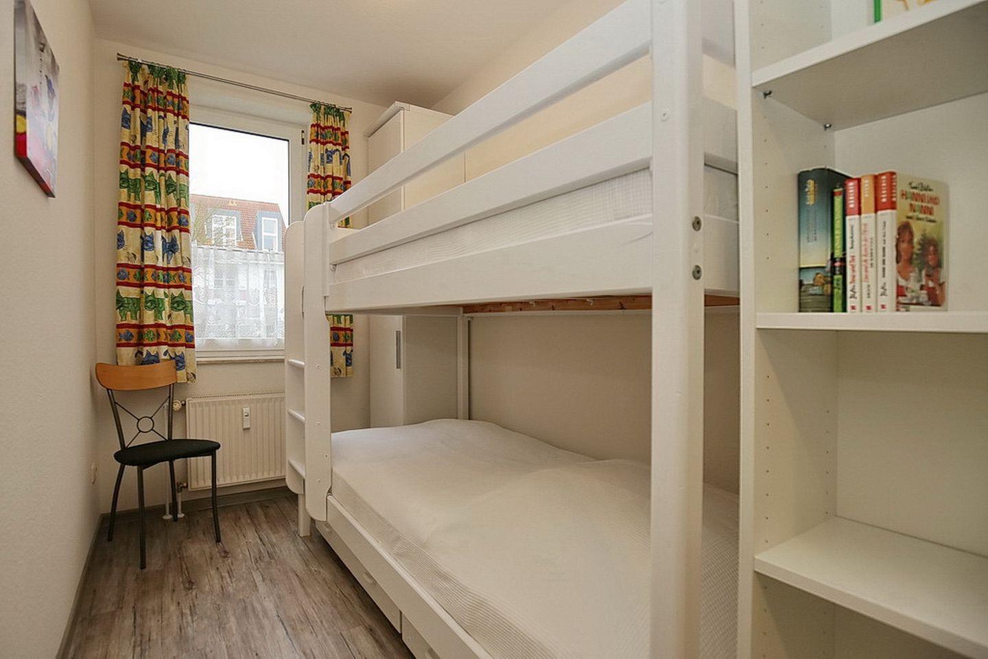 Im ersten Schlafzimmer steht ein Boxspringbett mit einer durchgehenden Liegefläche von 180 cm. Zur Verdunklung wurden Vorhänge an den Fenstern angebracht. Der Kleiderschrank bietet Platz für deine Urlaubsgarderobe. Im zweiten Schlafzimmer haben zwei Personen im Etagenbett ihren Schlafplatz. Hier befinden sich ein Kleiderschrank und ein Bücherregal.